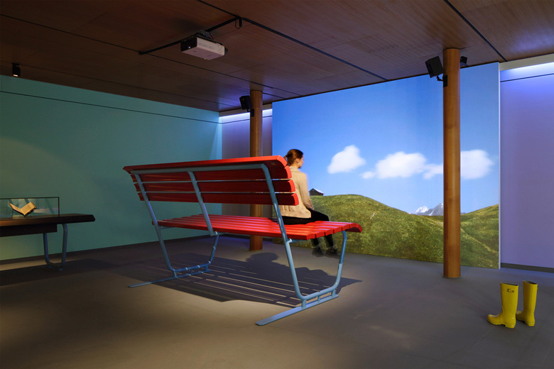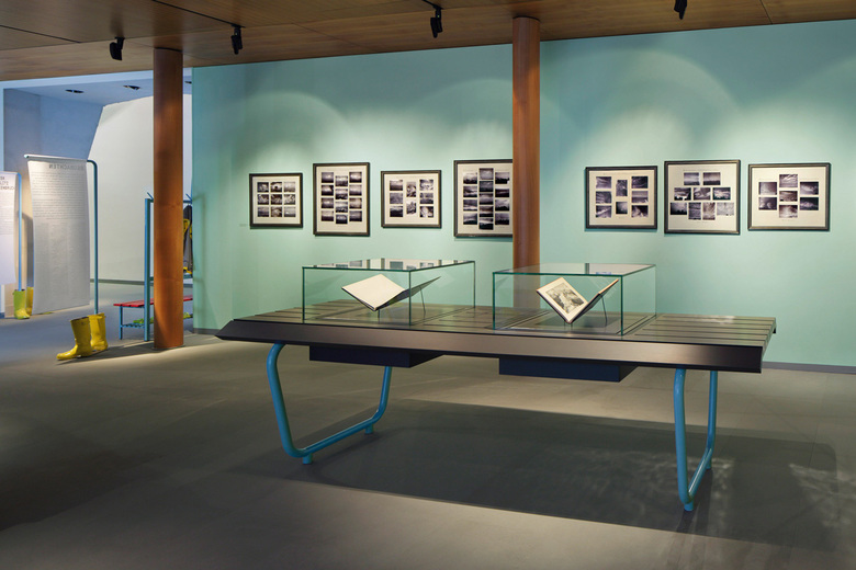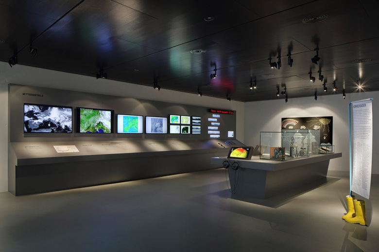 Die von Bureau Hindermann inszenierte Ausstellung beginnt gleich da, wo das Wetter passiert: draussen vor dem Museum. Rote Liegestühle laden dazu ein, sich erst mal hinzusetzen, in den Himmel zu gucken und das aktuelle Wetter zu erfahren. Wer anschliessend das Gebäude betritt, gelangt zu einer Garderobe mit leuchtend gelben Regenjacken. Sie sind die augenzwinkernde Erinnerung daran, dass es kein schlechtes Wetter gibt, nur schlechte Kleidung. Gelbe Gummistiefel führen von hier als Leitelement durch die gesamte Ausstellung. Die grafische Gestaltung erfolgte in Zusammenarbeit mit Pikka Kommunikationsdesign und David Clavadetscher.