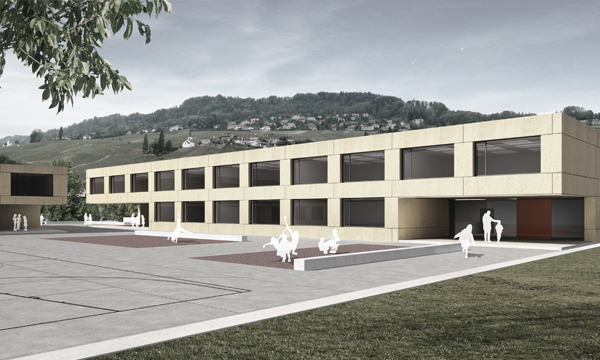 La parcelle située à la limite de la partie basse du village, a proximité d’une zone de villas, permet de créer un élément urbain pour le quartier mais également pour le village : un espace collectif de rencontre. Deux formes urbaines simples, la barre et le plot, génèrent cette place protégée qui devient le préau de l’école et une place publique en dehors des horaires scolaires. La tension manifeste entre les 2 volumes urbains marque l’accès aux bâtiments et défini un parvis public pour l’école. Des évidements pratiques dans ces volumes créent trois préaux couverts, l’un marque l’entrée du bâtiment scolaire, l’autre, celui de la salle de gymnastique. Le troisième, celui de l’UAPE. Une série de murs de faible hauteur (50 cm) génèrent un socle qui rassemble les 2 formes urbaines, le préau ainsi que les installations sportives.  Cette légère différence de niveau entre la rue et le préau protège les utilisateurs du trafic routier et renforce son statut exclusivement piéton.  Ces murets organisent l’espace public et précisent la limite entre le socle et la rue d’Allaman et lie l’espace public de l’école avec le village. A ce titre, il réinterprète un élément présent dans l’inconscient collectif du village (murs qui délimitent et relient des parcelles vigneronnes aux abords du village de Féchy).