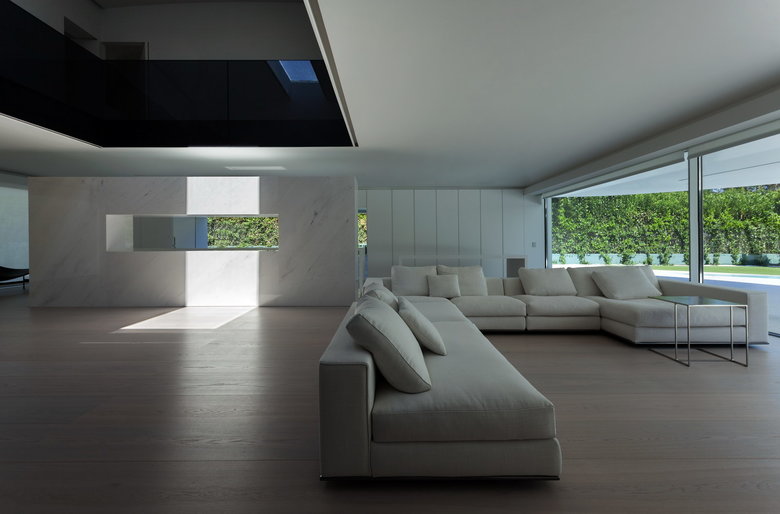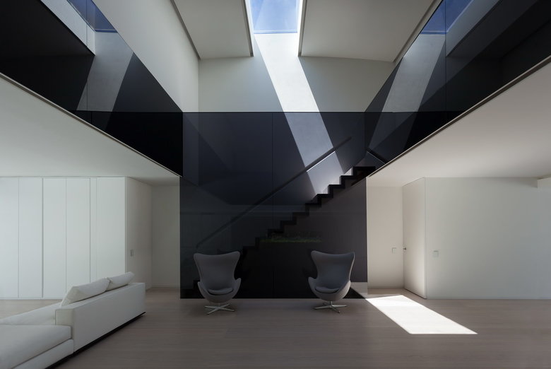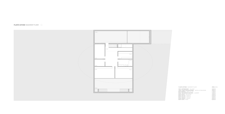 El espacio interior de la vivienda se articula mediante un vacío central en el que se encuentra el núcleo de comunicación. Los espacios de servicio, las instalaciones y la cocina, permiten ortogonalizar el trazado curvo de una planta baja abierta al jardín. La planta superior con las habitaciones y la planta sótano abierta al patio dotan a la vivienda de espacios acotados.