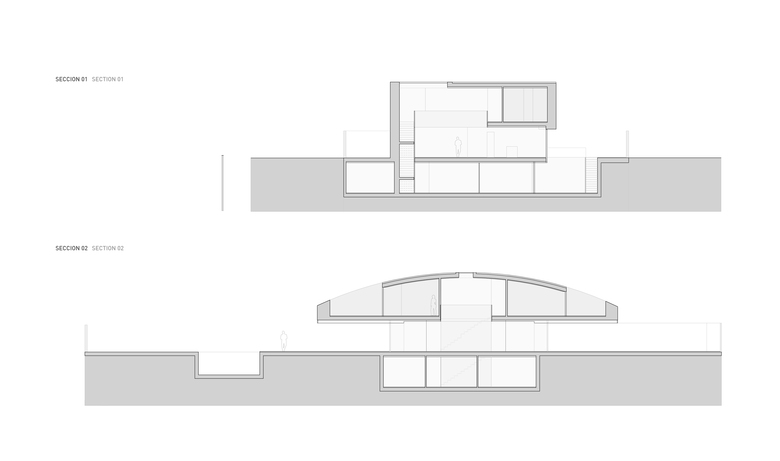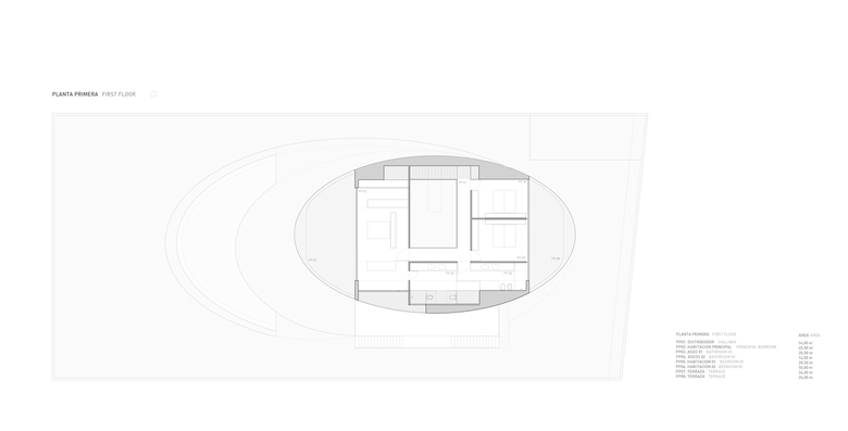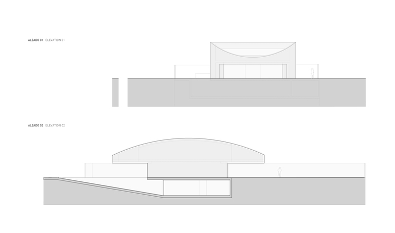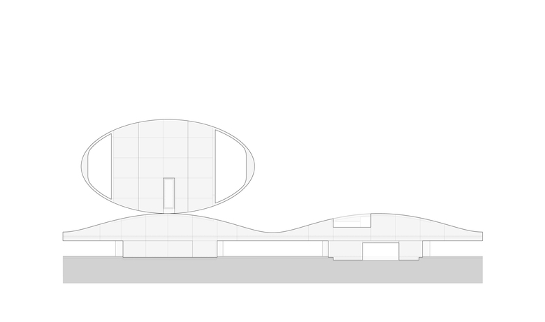 La propuesta se dibuja a través de trazas elípticas que contienen el programa, maximizando las posibilidades dadas por la normativa y minimizando el impacto volumétrico sobre el lugar. Se dispone así una pieza con una fachada continua, que parece albergar una única planta y cuya condición visualmente aerodinámica hace que la mirada fugue hacia la profundidad del paisaje vecino.