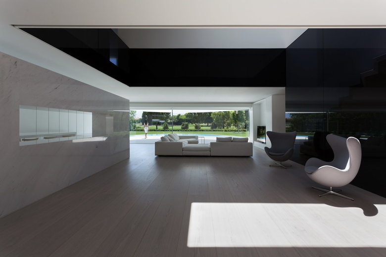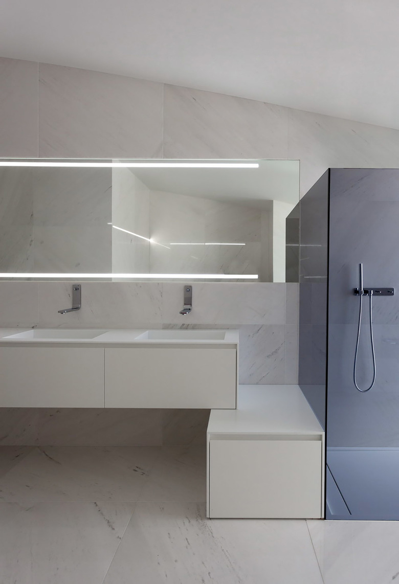 La estructura de hormigón de la planta baja sostiene mediante cuatro soportes el arco de cubierta del que cuelga el forjado de la zona de noche. Esta estructura se recubre mediante una fachada ventilada monolítica realizada con un Solid Surface que con simple curvatura y sin necesidad de termoconformarse se adapta a la geometría de la pieza. El resto de materiales van del blanco al negro pasando por todos los grises.