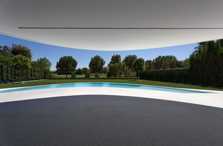 La pieza se deposita liberando la mayor superficie posible en el frente sur de la parcela para aprovecharla como jardín. Los limites laterales intentan desdibujarse mediante la vegetación. El resto de elementos que configuran la urbanización recuerdan la naturaleza curva de la topografía del lugar.