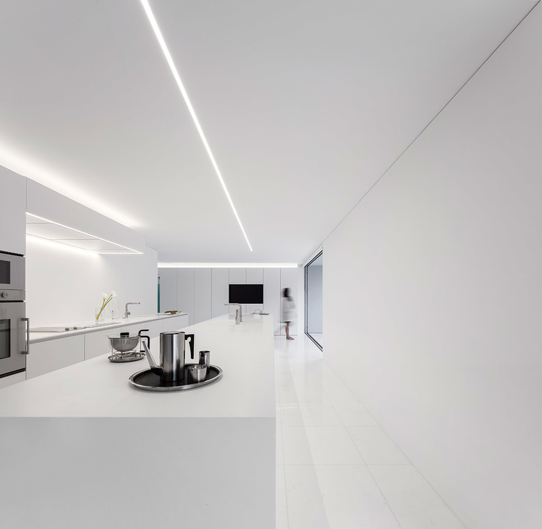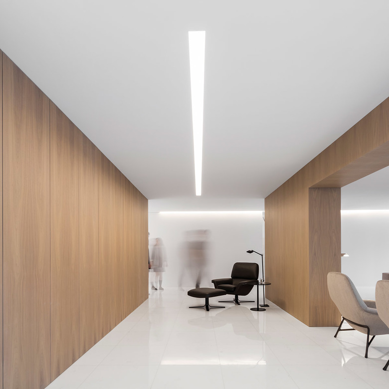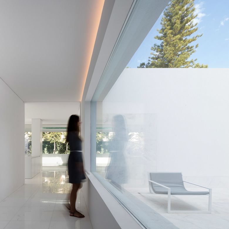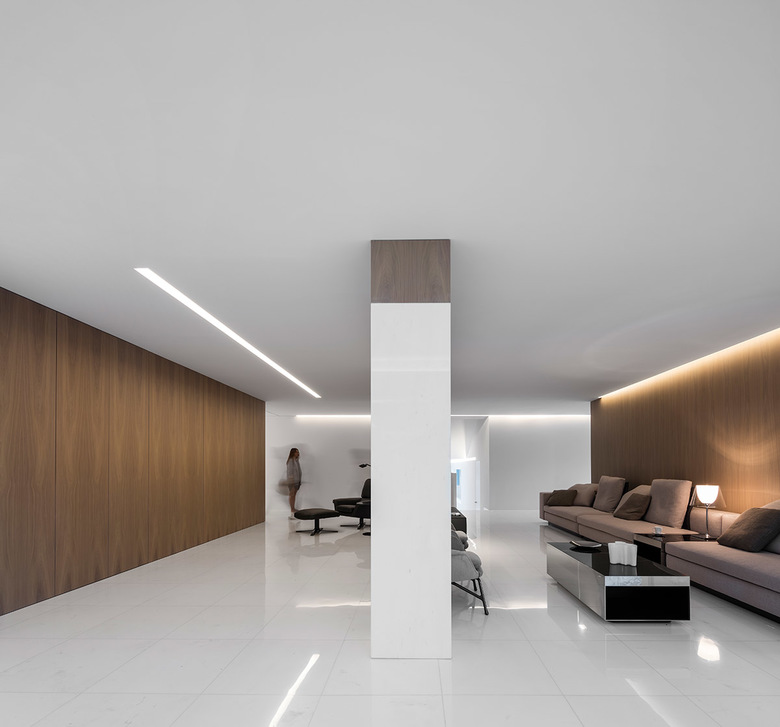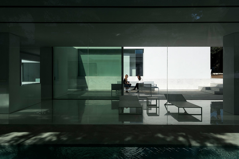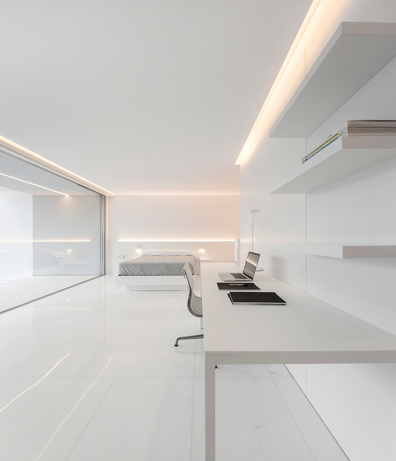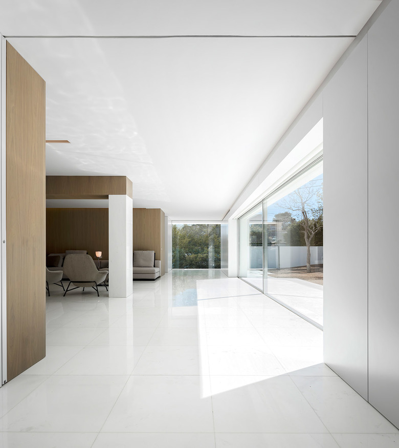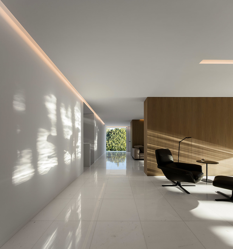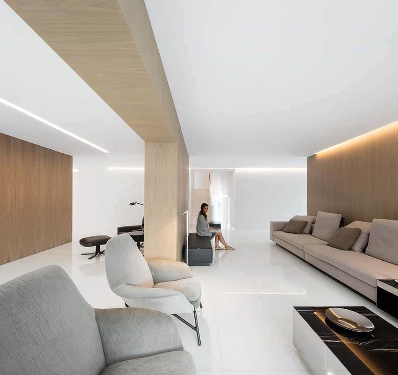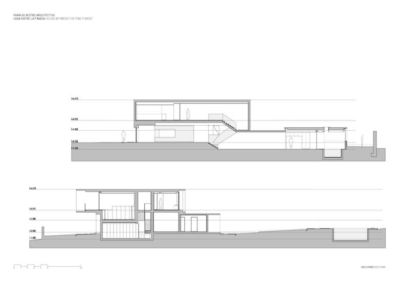 El interior respeta el sistema de seminiveles produciendo una gran heterogeneidad espacial con estancias con una gran diversidad de dimensiones y alturas. La estructura portante de la vivienda original se aloja en el interior del mobiliario que tiene la misma tonalidad gris que los troncos de alguna de las especies que habitan el jardín.