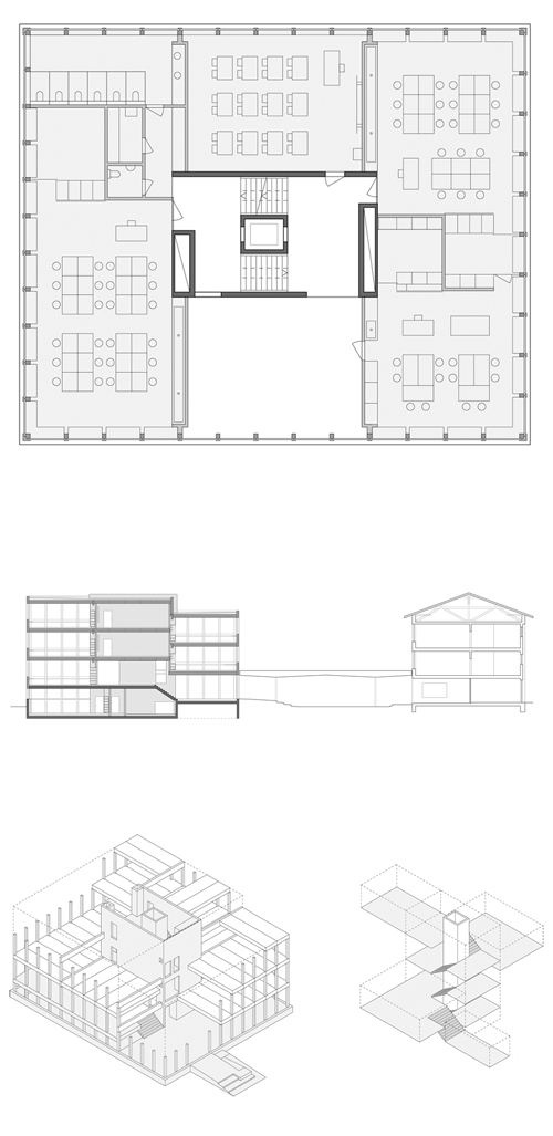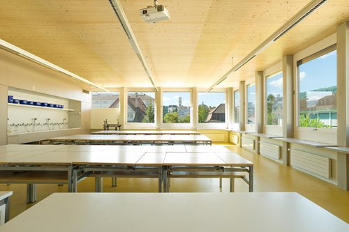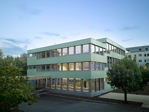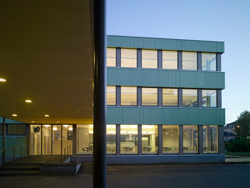 Die ausgedehnte, sternförmige Schulanlage, die bereits mehrmals erweitert wurde, erhält einen präzisen und kompakten Baukörper hinzugefügt. Die von den bestehenden Bauten losgelöste Erweiterung ermöglicht es, die Qualitäten der Aussenräume zu wahren und weiterzuführen. Die Schnittlösung mit Splittlevel ergibt eine sinnvolle Verteilung des heterogenen Programmes: Mensa mit Küche, Werkräume, Bibliothek, Schüleraufenthalt, Lehrerzimmer, Zeichensäle und Klassenzimmer. Die Gebäudestruktur aus Holz ist modular konzipiert: sie lässt sich entlang des aussteifenden Erschliessungskernes aus Beton vertikal erweitern und sich den ändernden Bedürfnissen der Benutzer anpassen. Die Fassade aus farbigem Holz zieht sich in Form von durchgehenden Bändern um das Gebäude, deren Höhen sich mit den verschiedenen Funktionen und versetzten Geschossdecken verändern. Das Tragsystem soll weitgehend vorfabriziert werden, um die Bauimmissionen auf ein Minimum zu reduzieren. Der Neubau erfüllt die Anforderungen des Minergie-Standards.