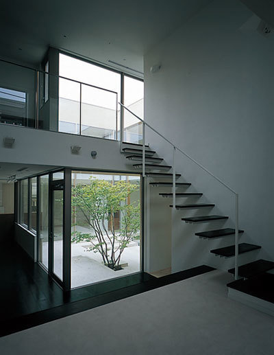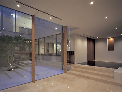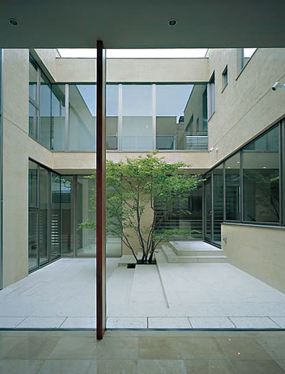 This is the court house we named "Pin wheel configuration House". 4L-shaped big walls are placed in the configuration like blade of the pinwheel. Luxurious and comfortable living spaces are provided along the L-shape walls, in the sequence of patio and the outside garden between walls.