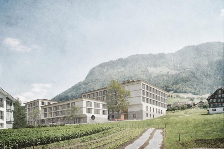 In Stans am Fuss des Stanserhorns befindet sich das Alterszentrum Nägeligasse. Das Projekt besteht aus 3 Neubauten, welche die über die Jahre verunklärte Situation neu strukturieren sollen. Direkt an der Nägeligasse befinden sich die beiden kleineren Volumen. Sie bewirken einen sanften Auftakt zum grösseren Hauptvolumen, welches durch seine Höhe einen eindrücklichen Ausblick über Stans gewährt, sich jedoch trotzdem optimal in die Dorfstruktur einfügt.
