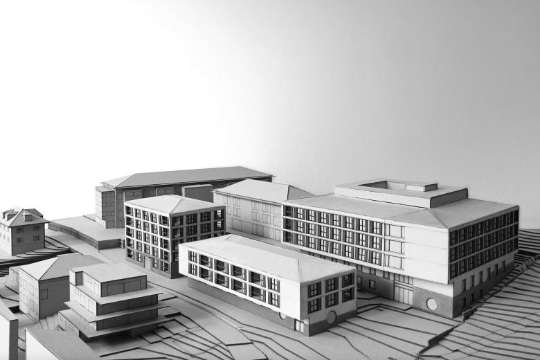 Die Anordnung der drei Volumen bezieht sich auf die traditionelle Anordnung von Gassen und Plätzen in der Stanser Altstadt. Damit wird eine interessante Bezogenheit zum Ort sowie eine vertraute Umgebung für die Bewohner geschaffen.