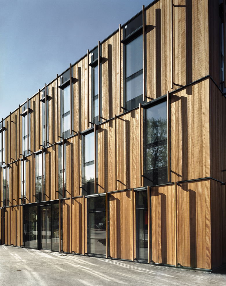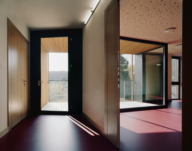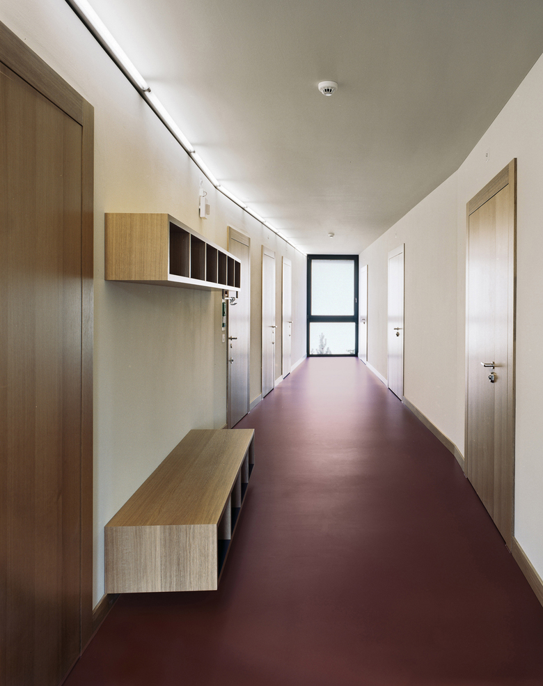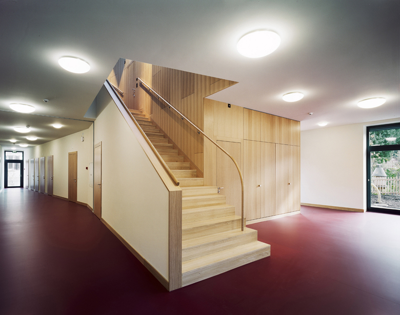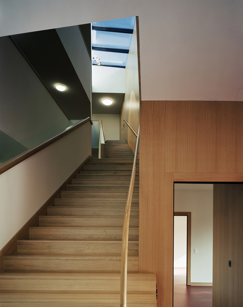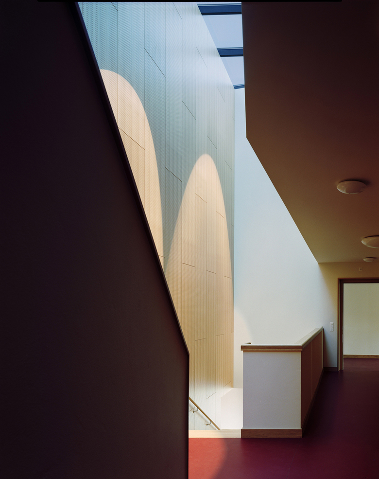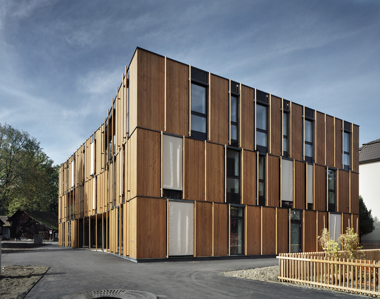 Der dreigeschossige, eigenständige Bau orientiert sich im Massstab an den freistehenden Gebäuden entlang der Eichwaldstrasse. Im Ausdruck sucht er einen Bezug zu den Holzbauten in der Umgebung. Die unregelmässige Form und die freie Zusammensetzung der Holzpaneele bewirken, zusammen mit den vertikalen Stäben, den verspielten Ausdruck. Das neue Behindertenwohnhaus versucht die Phantasie der Bewohner verstärkt anzuregen, indem die Gestalt keine starre Orthogonalität aufweist, sondern fliessende, weiche Räume, die sich öffnen und schliessen. Eine von oben belichtete zentrale Treppenanlage erschliesst die insgesamt vier Wohngruppen.