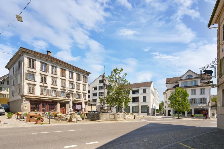 Ruswil als ehemals wichtiger Marktort und weiterhin bedeutende Landgemeinde repräsentiert sich im schön erhaltenen Dorfplatz im Zentrum des Dorfes. Das Projekt besteht aus drei Baukörpern, teils auf einem Sockel ruhend, welche sich mit ihren Giebelfassaden je nach örtlicher Gegebenheit stärker oder schwächer artikulieren. Mit leichten Überschiebungen gegenüber dem Sockelbereich wird auf die jeweilige ortsbauliche Stellung reagiert und sind so platziert, dass spannende Durchsichten und örtliche Bezüge stattfinden.Vorgeschlagen wird eine durchgängige Ladengasse, welche die Attraktivität desselben erweitert. Es ergibt sich, ausgehend vom Hauptplatz, ein attraktives Fussgängerwegnetz, welches unterschiedliche Plätze bis zum grossen Marktplatz verbindet. Im nördlichen Gebäudeteil befinden sich über dem Sockelgeschoss die Personalräume und die innenliegende Anlieferung vom Grossverteiler. Ein vielfältiges Wohnungsangebot von Kleinwohnungen bis zu grosszügige Familienwohnungen gruppieren sich um den zentralen, halbprivaten Innenhof über dem Sockelgeschoss. Die Bauten werden in konventioneller, massiver Bauweise erstellt. Die tragenden Fassadenwände sind massiv aus Beton oder Backstein. Im Ausdruck spielen die neuen Bauten gezielt mit regionalen Bauelementen, wie die Klappläden, den ortstypischen Dach- und Gebäudetypologien oder den Sockelthemen wie Eingänge und Schaufenster.
