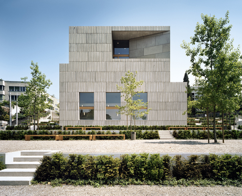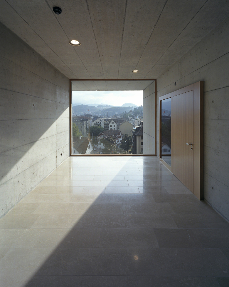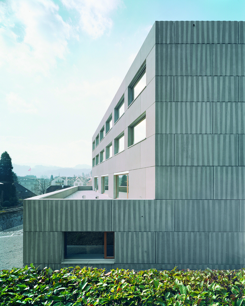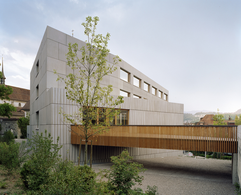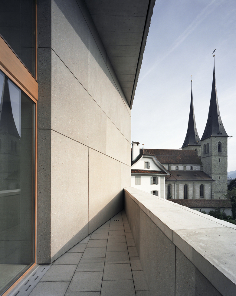 Das Areal des Stiftbezirks im Hof Luzern wird am Kapuzinerweg erweitert durch ein weiteres eigenständiges Gebäude, wie es die Hofkirche, die Propstei oder das Priesterseminar darstellen. Die Oberflächen des Sichtbetons bestehen aus vorgehängten, glatten und reliefartigen Betonelementen in Anlehnung an die Bruchsteinmauern der Hofkirche. Terrassen mit meterhohen Mauern und vorgelagerten Hecken zeichnen das Hangrelief.