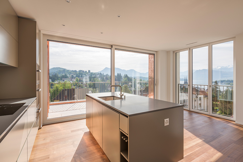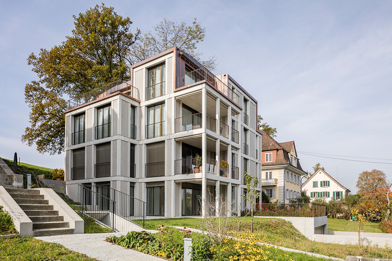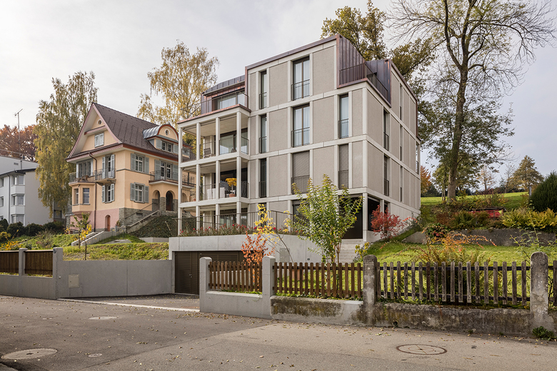 Der Neubau an der Oberen Bergstrasse reiht sich zwischen den Nachbarbauten auf selbstverständliche Art und Weise ein. Durch Rücksprünge und Versätze in der Fassade, welche spannende Ausblicke über Eck ermöglichen, wird eine massstäbliche Eingliederung in das Ensemble erreicht. Die Typologie der Wohnungen mit einem innenliegenden Vestibül orientiert sich an den umliegenden Villen aus dem frühen 20. Jahrhundert. Die Gliederung der Fassaden geschieht mittels horizontalen und vertikalen Gewänden. Die zurückversetzten Füllungen artikulieren sich durch eine gröbere Oberfläche und kontrastieren so mit den glatten Gewänden.