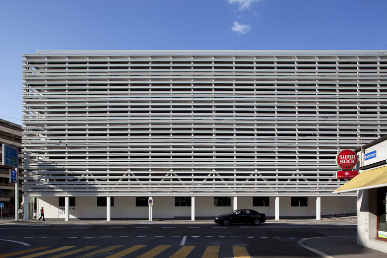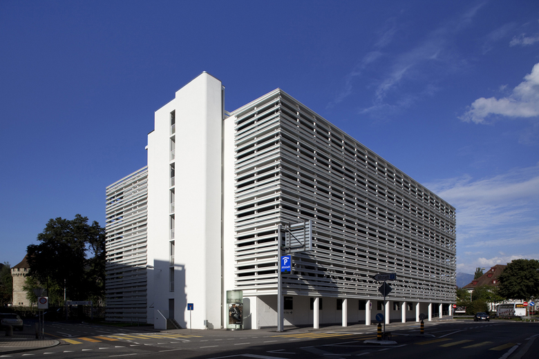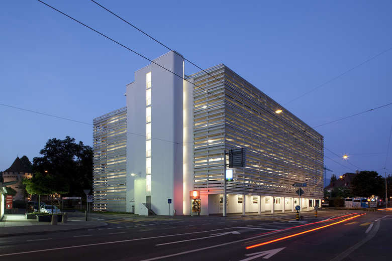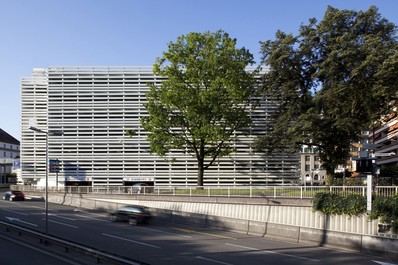 Das Parkhaus Altstadt musste saniert und aufgestockt werden. Die Betonelemente des bestehenden Zweckbaus wurden von den Fassaden entfernt und stattdessen mit weiss einbrennlackierten und mit Metallpigmenten versehenen Leitplanken verkleidet. Tagsüber strahlen nun die weissen Metallbänder, nachts das Licht, welches zwischen diesen Bändern hervorblitzt. Neue Lifte, grosszügige Verglasungen im Erdgeschoss und das vollständig weiss gestrichene Innere machen das Parkhaus hell und übersichtlich und erzeugen ein angenehmes Raumgefühl.
