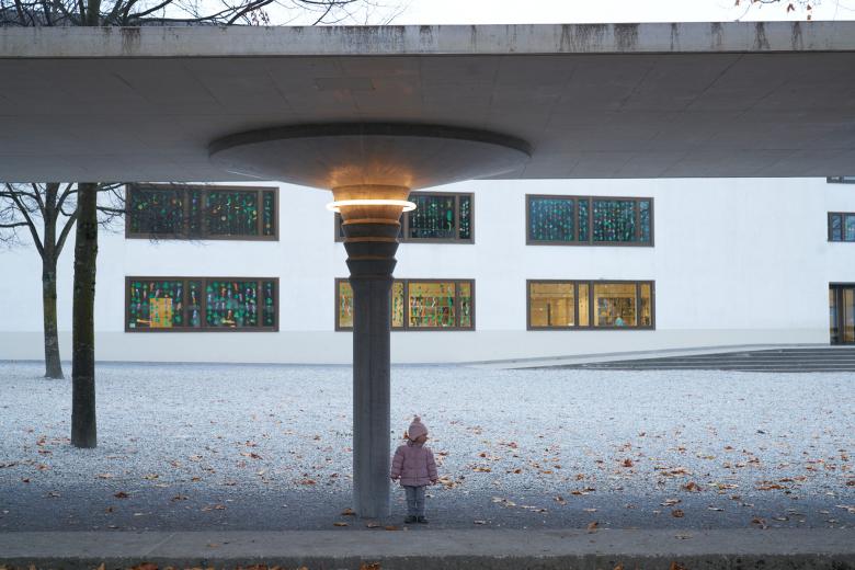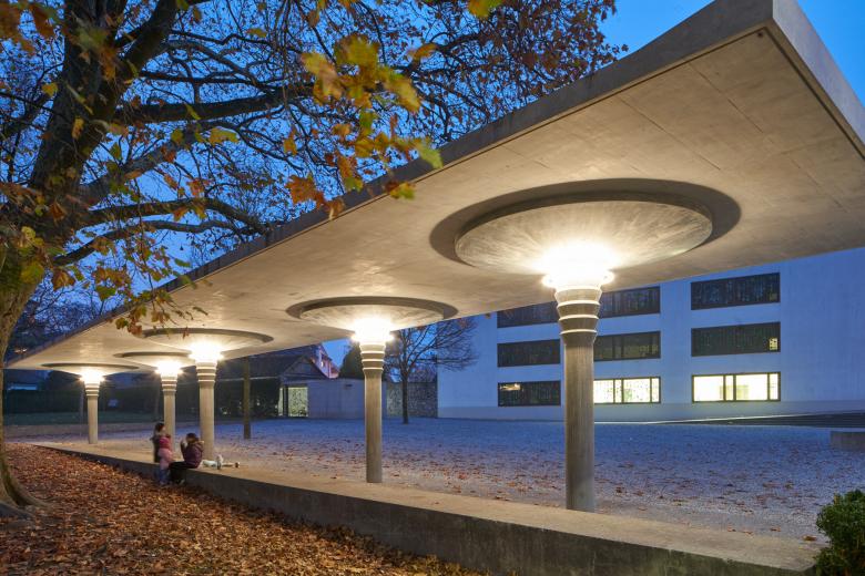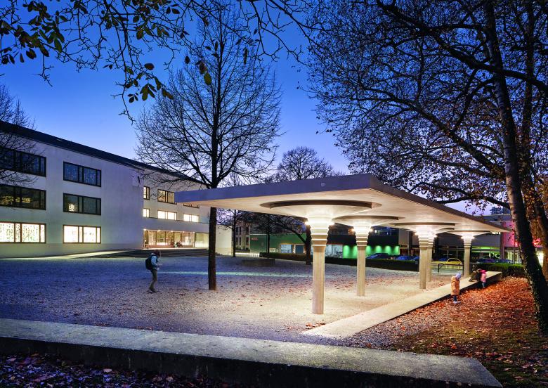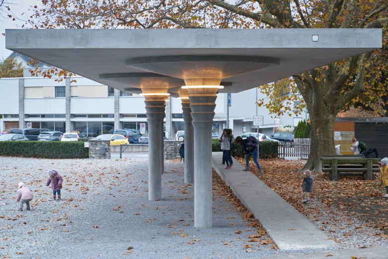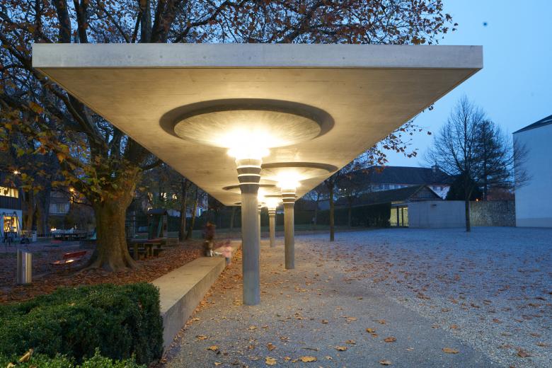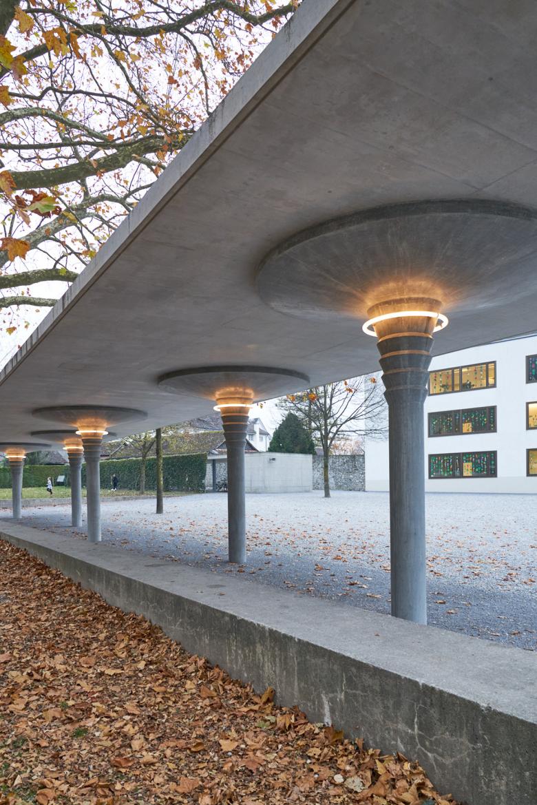Die neue Pausenhalle des Primarschulhauses St. Karl bietet den Kindern eine gedeckte Aufenthaltsmöglichkeit als Erweiterung des Pausenraumes. Die Auseinandersetzung mit dem Wurzelwerk der Bäume gibt die Lage der Betonstützen vor. Diese Unregelmässigkeit schafft gleichzeitig den spielerischen Aspekt, der durch die Pilzform der Stützen als umgekehrte Hurlibusse noch einmal verstärkt wird. Den bestehenden Sitzbänken folgend, bietet ein neuer Belag die hindernisfreie Erschliessung bis zum Haupteingang.