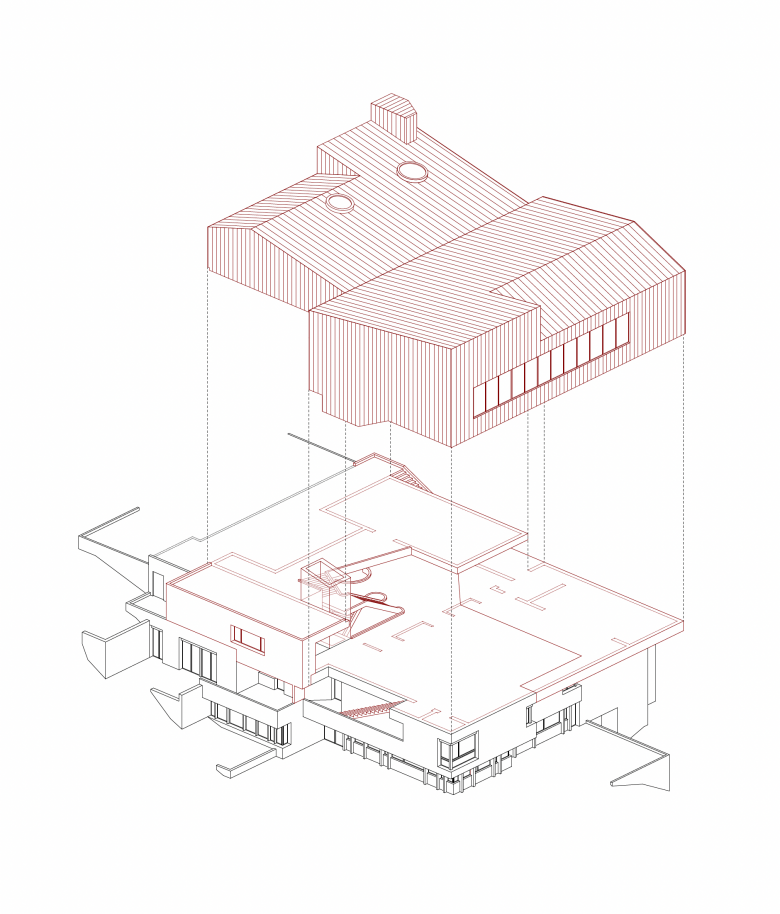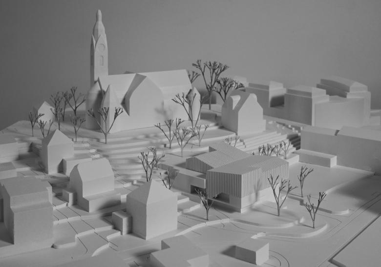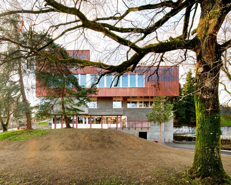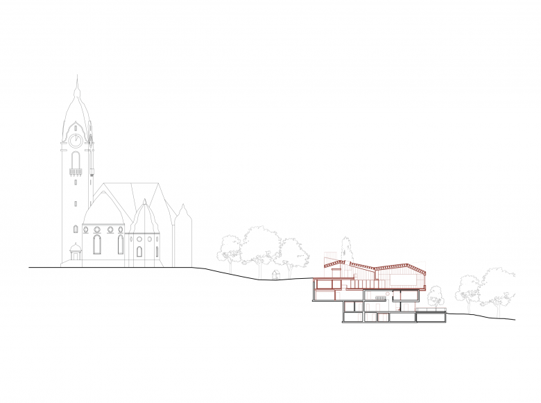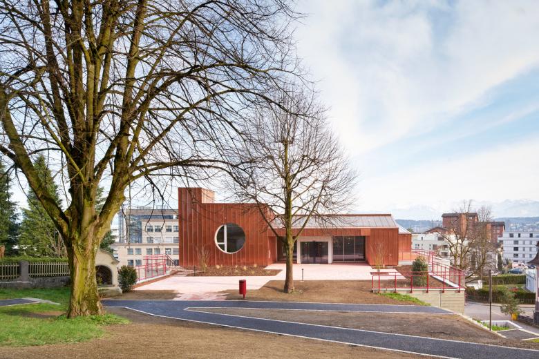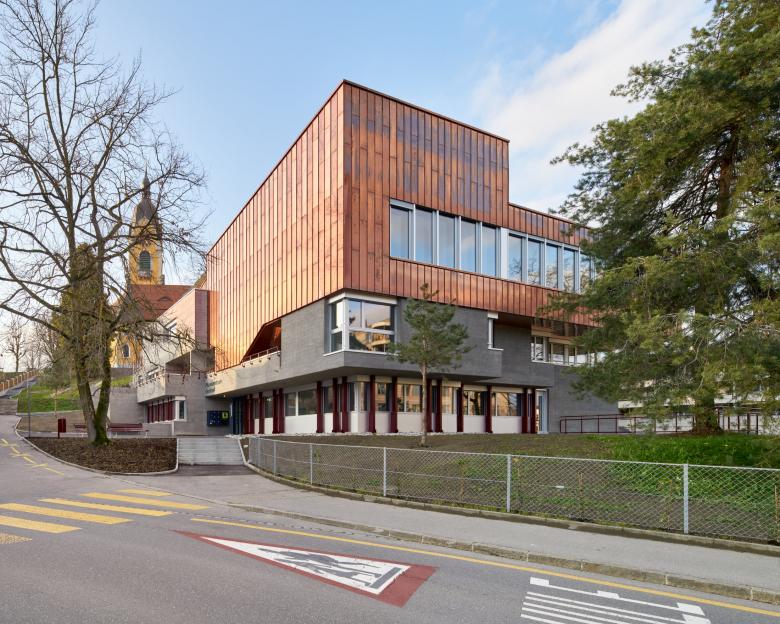 Das Kirchenareal in Gerliswil mit seiner markanten neobarocken Kirche bildet eine idyllische Oase im Herzen von Emmenbrücke. Das bestehende Kirchgemeindehaus aus den 70er Jahren zeigt sich als brutalistischer Betonbau, der sich seitlich in den Kirchenhang integriert. Seine Volumetrie tritt respektvoll gegenüber der Kirche in den Hintergrund, entfaltet jedoch, im expressiven skulpturalen Stil der damaligen Architektur, eine eigenständige Präsenz. Der Umbau und die Erweiterung des Pfarreizentrums wurden zum Anlass genommen, die Volumetrie zu klären und die Prägnanz des Gebäudes zu stärken. Der bestehende Bau bildet nun den massiven Sockel für den neuen Saalaufbau, der durch seine markante Silhouette und differenzierte Materialwahl wie eine Krone auf dem Bestand thront, seine neue Funktion als öffentliche Institution eindrucksvoll repräsentierend.