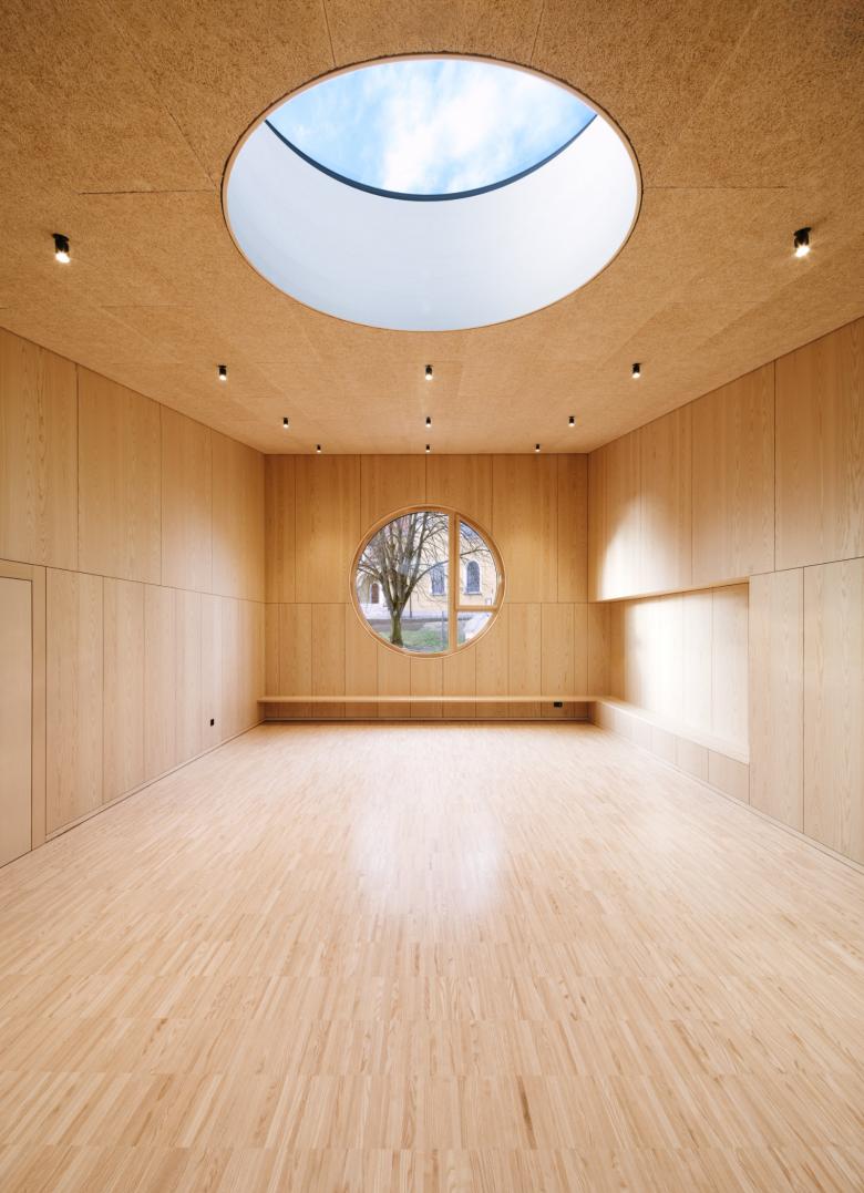 Der Aufbau des Mehrzwecksaales ist als Holzbau konzipiert. Dementsprechend werden auch die inneren Oberflächen mit Holz verkleidet. Eschenholz schafft ein freundliches Raumgefühl und einen schönen Raumklang. Die Verkleidung des Aufbaus mit Kupferblech greift das Dachmotiv der Kirche auf und verstärkt die ikonografische Gesamtwirkung des Gebäudes.