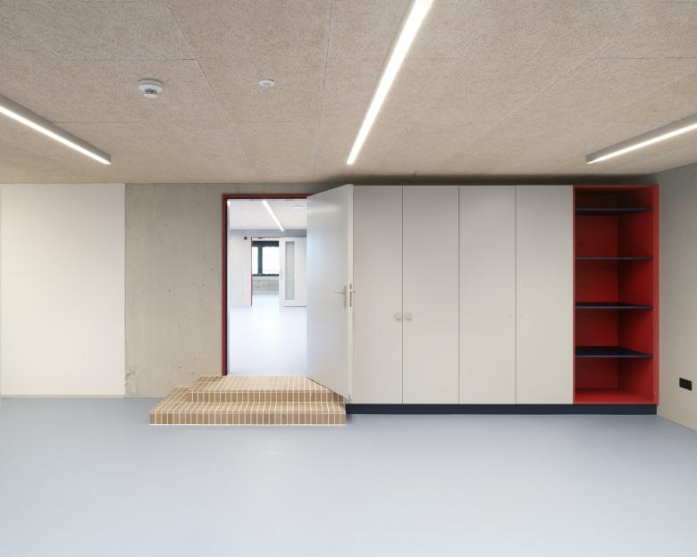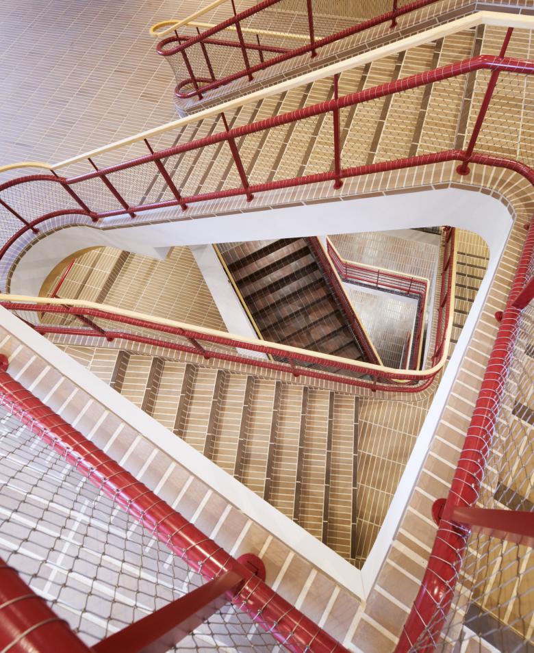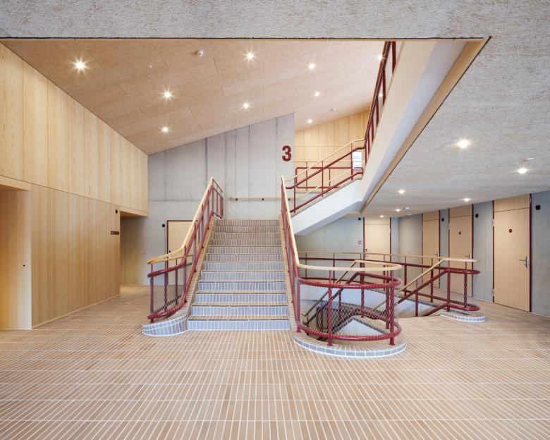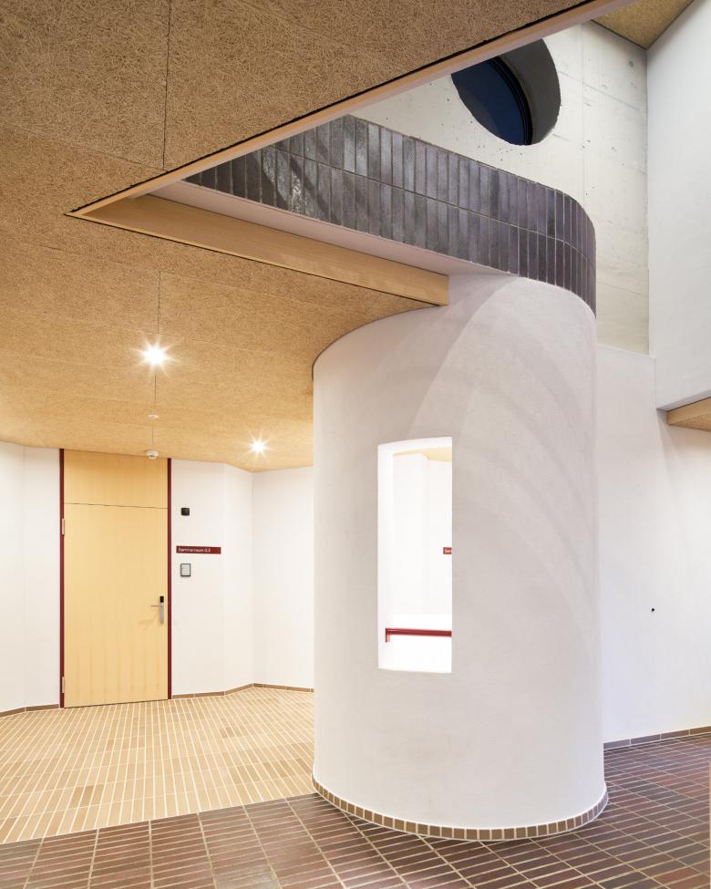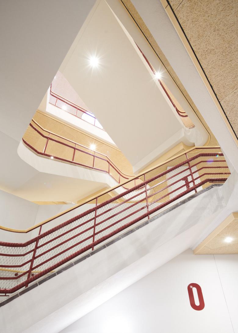 Das Treppenhaus bleibt weiterhin die verbindende Achse im gesamten Gebäude und wird bis zur erweiterten obersten Etage fortgeführt. Die Transparenz im Erschliessungsraum wird durch Durchbrüche zwischen den Geschossen gesteigert, wodurch beeindruckende Durchblicke über alle Ebenen entstehen. Die Collage aus Alt und Neu prägt die Innenräume. Es entsteht eine spielerische und überraschende Innenwelt, welche einen angenehmen und inspirierenden Aufenthalt für die Nutzer ermöglicht.