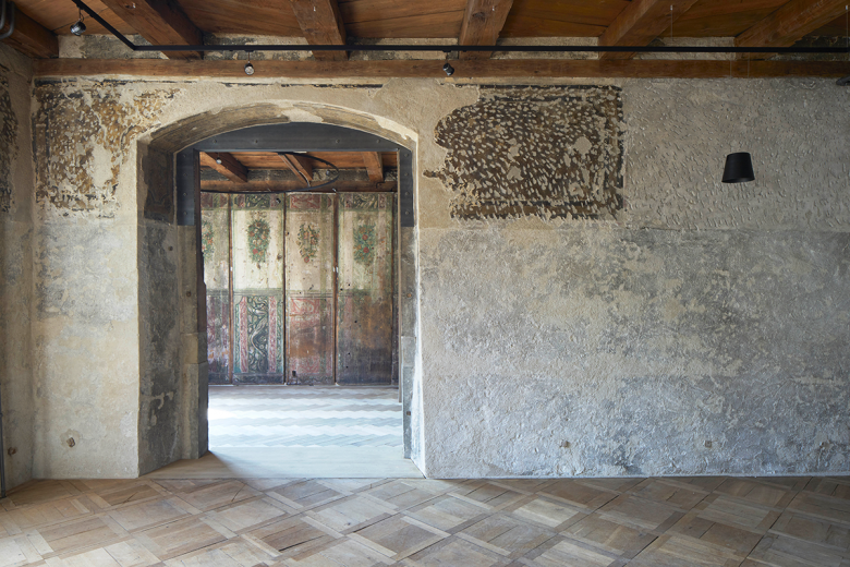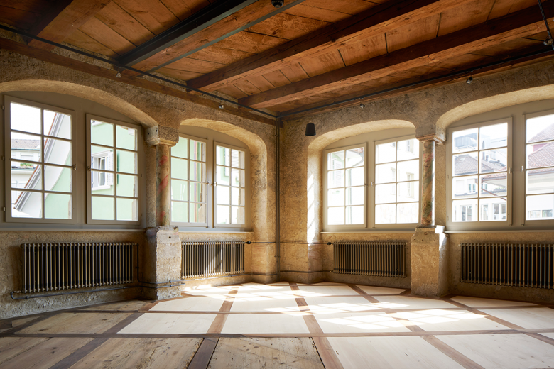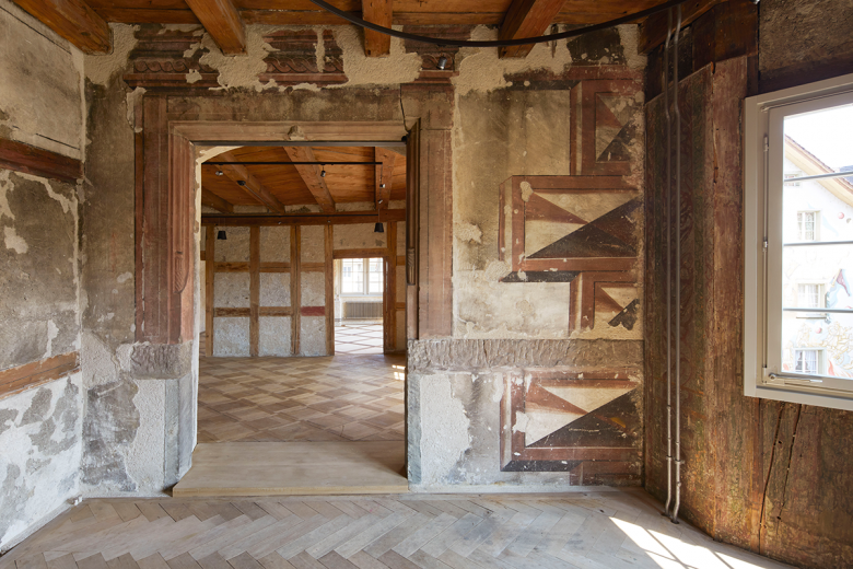 Die Zimmer der damaligen Wohnungen/Lager und nachträglich eingebaute Nassbereiche, Doppelböden und abgehängte Decken wurden rückgebaut. Die Tragstruktur sowie bestehende Leitungsführungen wurden durch den Umbau nicht tangiert. Während diesen Arbeiten sind denkmalpflegerisch relevante Malereien und Objekte entdeckt worden. Lussi + Partner hat zusammen mit der kantonalen Denkmalpflege ein neues Konzept für den Umbau erarbeitet.