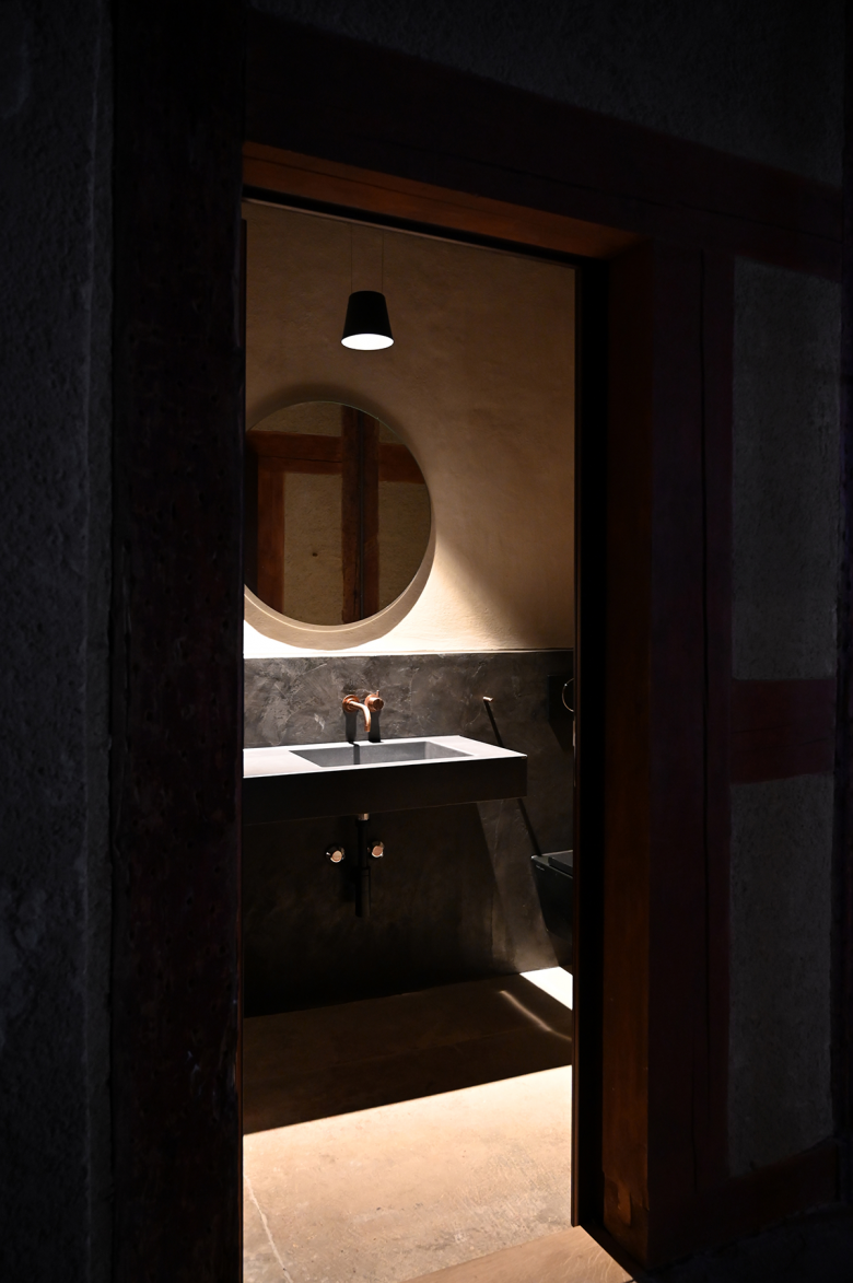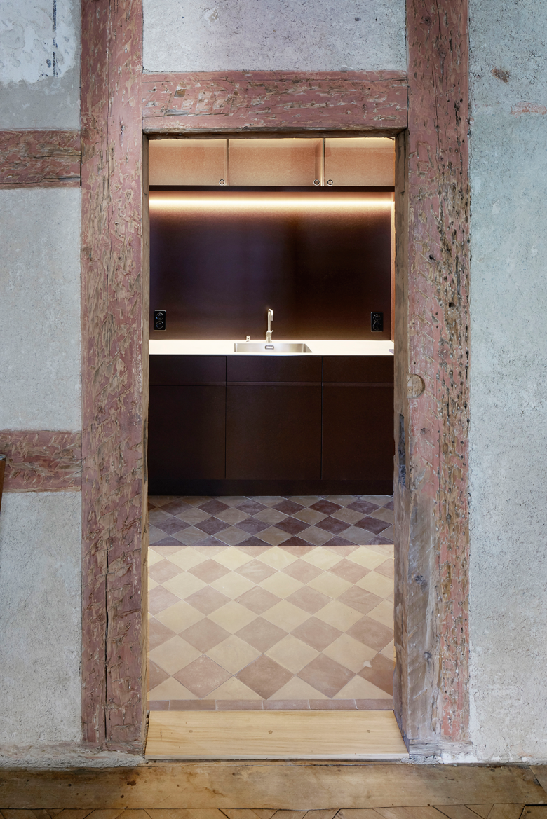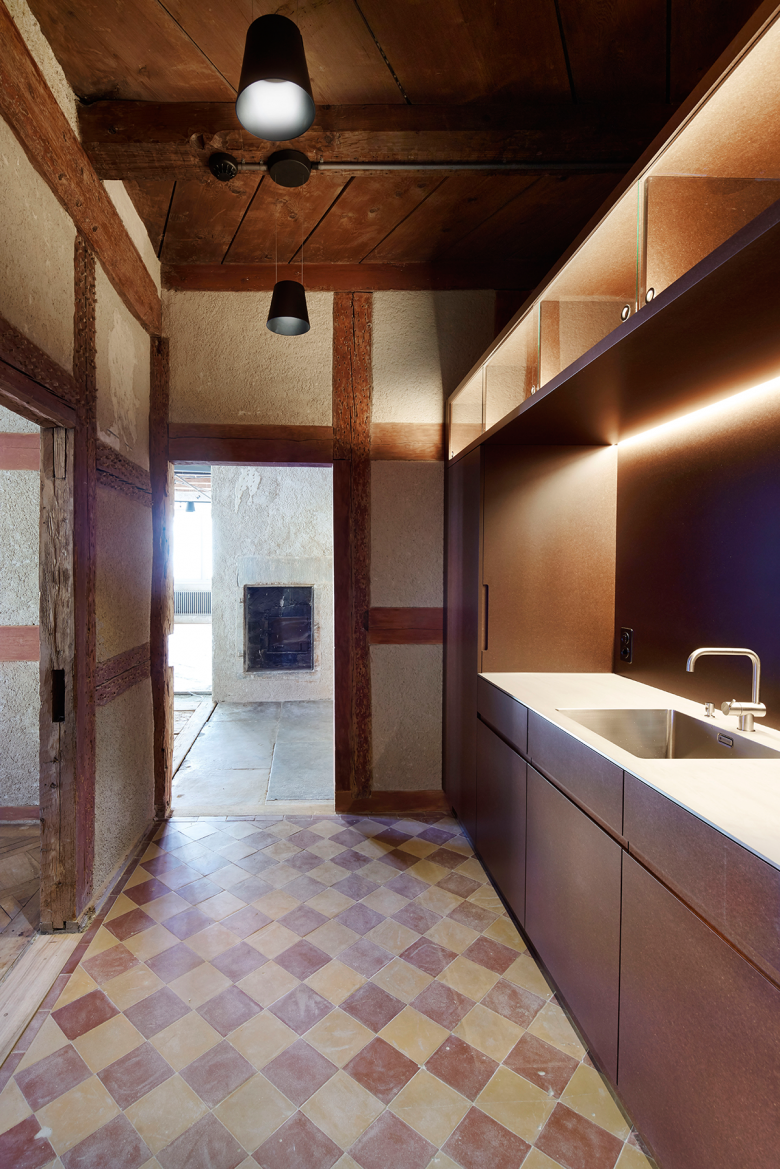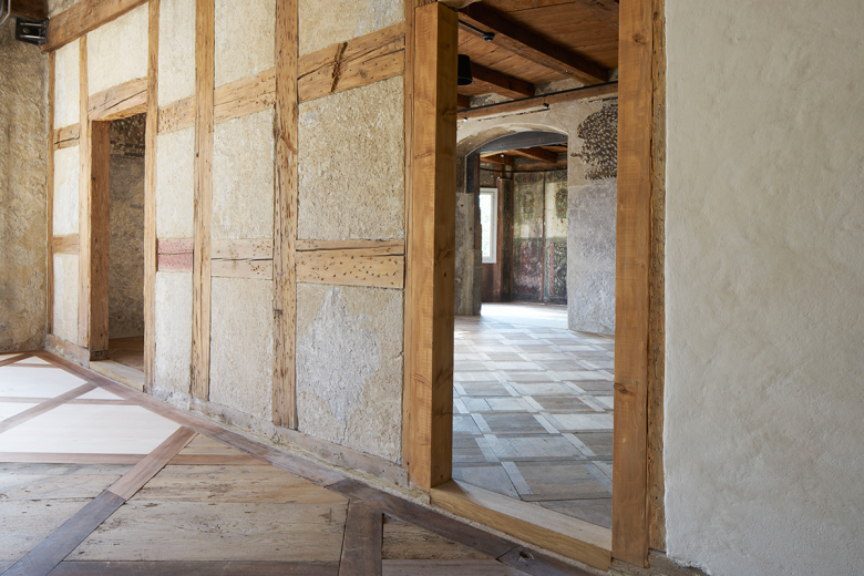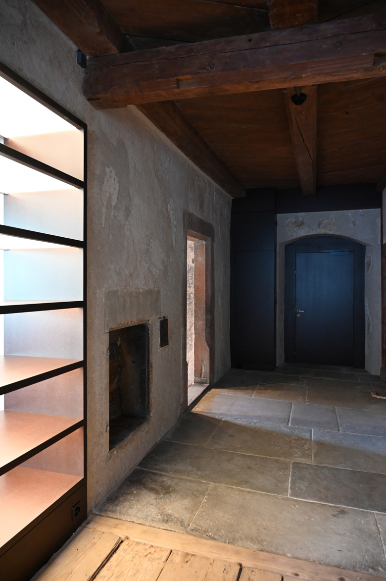 Dieses Konzept verfolgt die Idee, das Vorgefundene - die Geschichte und die Struktur des Hauses - zu belassen und zu zeigen. Es soll nichts erfunden werden und der Umbau darf einen provisorischen Charakter aufweisen. Die alten Holzböden aus dem 19. Jh. wurden gereinigt, punktuell repariert und teils rekonstruiert. Die Wände wurden auf Grundputzniveau zurückgeführt und gesichert; wertvolle Oberflächen waren zu erhalten und sanft zu restaurieren. Im Korridor hat man die Holzständerwand rekonstruiert und die Füllungen fachgerecht ausgefacht. Die Holzdecken wurden mit Seifenwasser gereinigt. Das Beleuchtungssystem, in Zusammenarbeit mit Baltensweiler AG ermöglicht eine flexible Beleuchtung der Ausstellungsstücke. Im Eingangsbereich wurde die bestehende Toilette erneuert und vergrössert; im Nebenraum eine Teeküche mit Garderobe eingebaut.