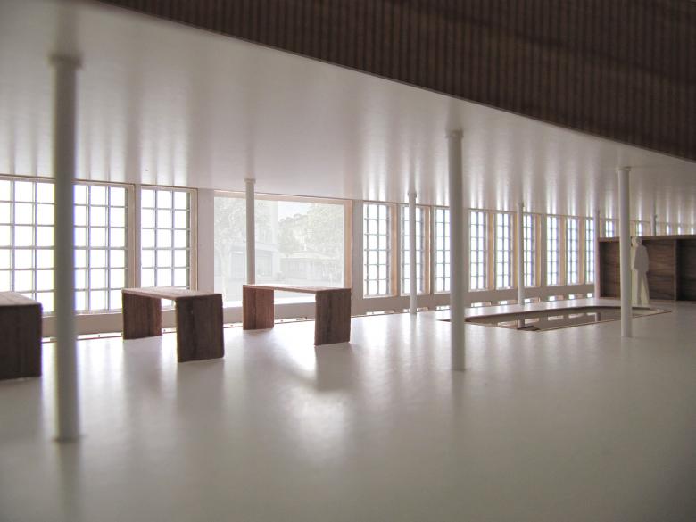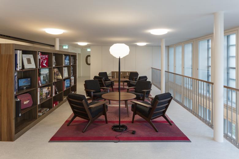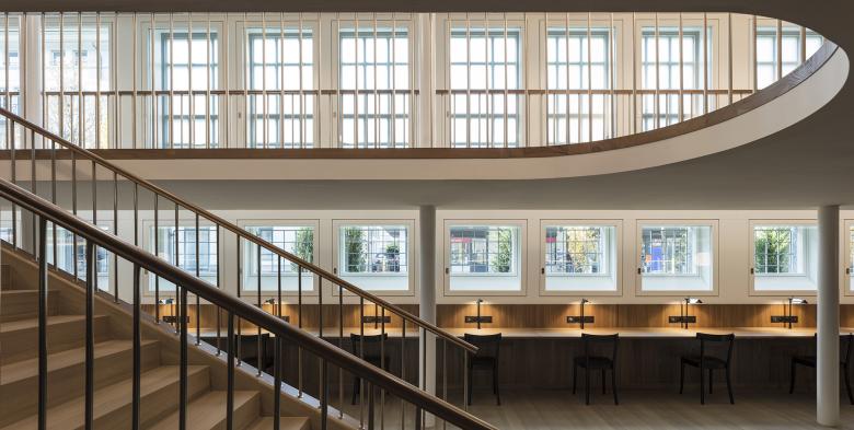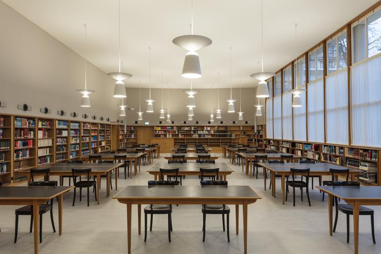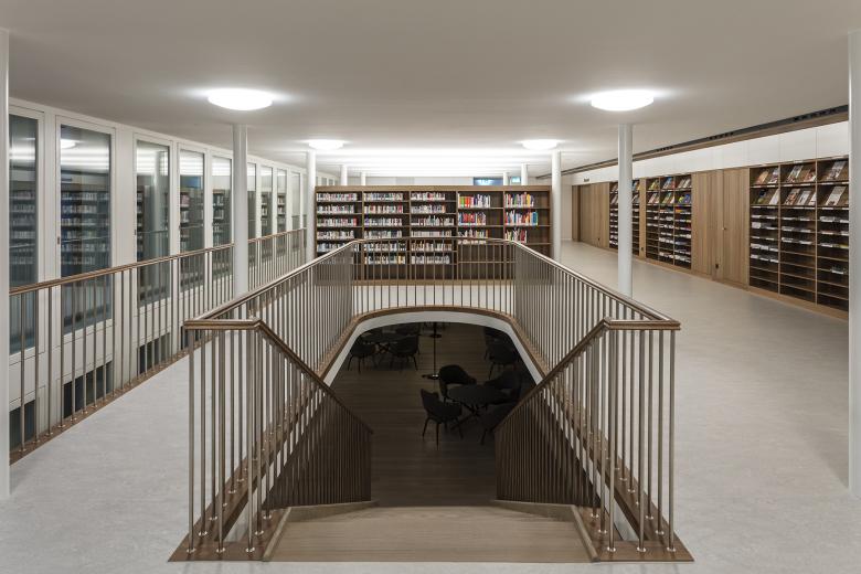 Der Schnitt des Gebäudes ist so angelegt, dass der Besucher beim Eintreten in den Raum die volle Höhe des Gebäudes spürt. Über Oberlichter entlang der Ostfassade gelangt Tageslicht bis ins Erdgeschoss. Die Lese- und Arbeitsplätze befinden sich entlang dieser neuen Galerien. Das Erdgeschoss wird durch eine zusätzliche, neue Treppe mit dem Untergeschoss verbunden. Ein Lichtschlitz entlang der Westfassade belichtet die Arbeitsräume und die Ausstellung der Sondersammlung. So entsteht ein offener, kontinuierlicher Raum im umgebauten Gebäude, und alle Geschosse werden räumlich miteinander verbunden. Durch die Offenheit wirkt die Freihandbibliothek hell und freundlich, ganz im Sinne des modernen Postulates von Sonne, Licht und Luft.