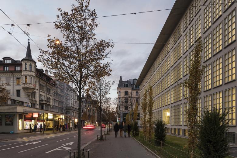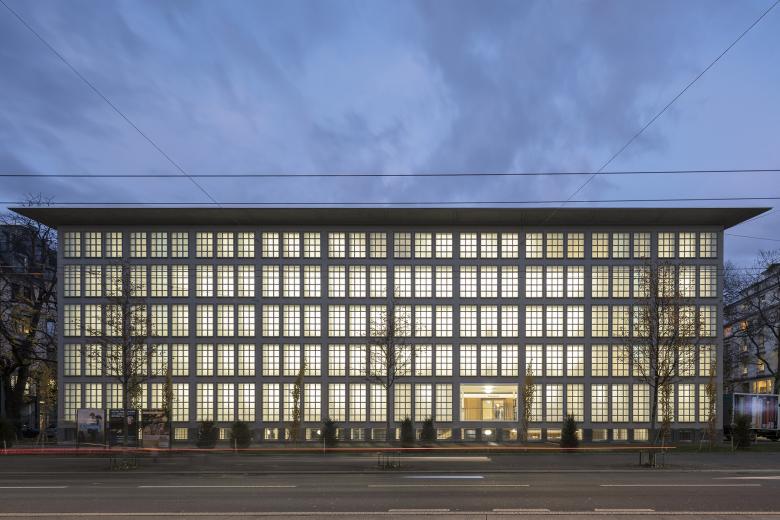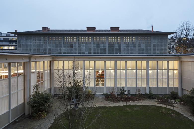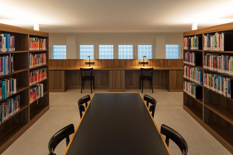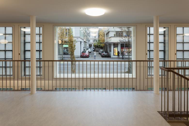 Die Materialisierung der Freihandbibliothek orientiert sich an den ursprünglichen Raumvorstellungen. Die Westfassade wird denkmalpflegerisch restauriert. Nur ein grosses Fenster weist zur Hirschmattstrasse auf die veränderte Nutzung hin.