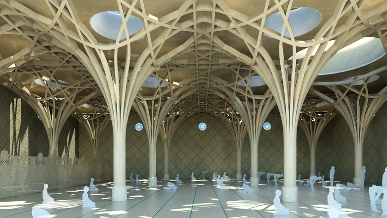 The new Mosque will accommodate a congregation of up to 1000 men and women. In addition to the Mosque’s dedicated areas (ablution, teaching, children’s area, morgue) there will be a café, teaching area and meeting rooms for use by the local Muslim and non-Muslim communities alike. The design draws its inspiration from ‘the Garden of paradise’ and water – the source of all life to create a calm ‘oasis’, with the ‘trees’ set out on a generous 7.8 x 7.8 metre grid forming the main mosque structure. The prayer hall is the heart of the building, organized around the mihrab with the principal dome above it. Between the structural ‘trees’ within the prayer hall, soft natural light filters in through circular glass domes. New cypress trees create a new permeable green edge around the building.