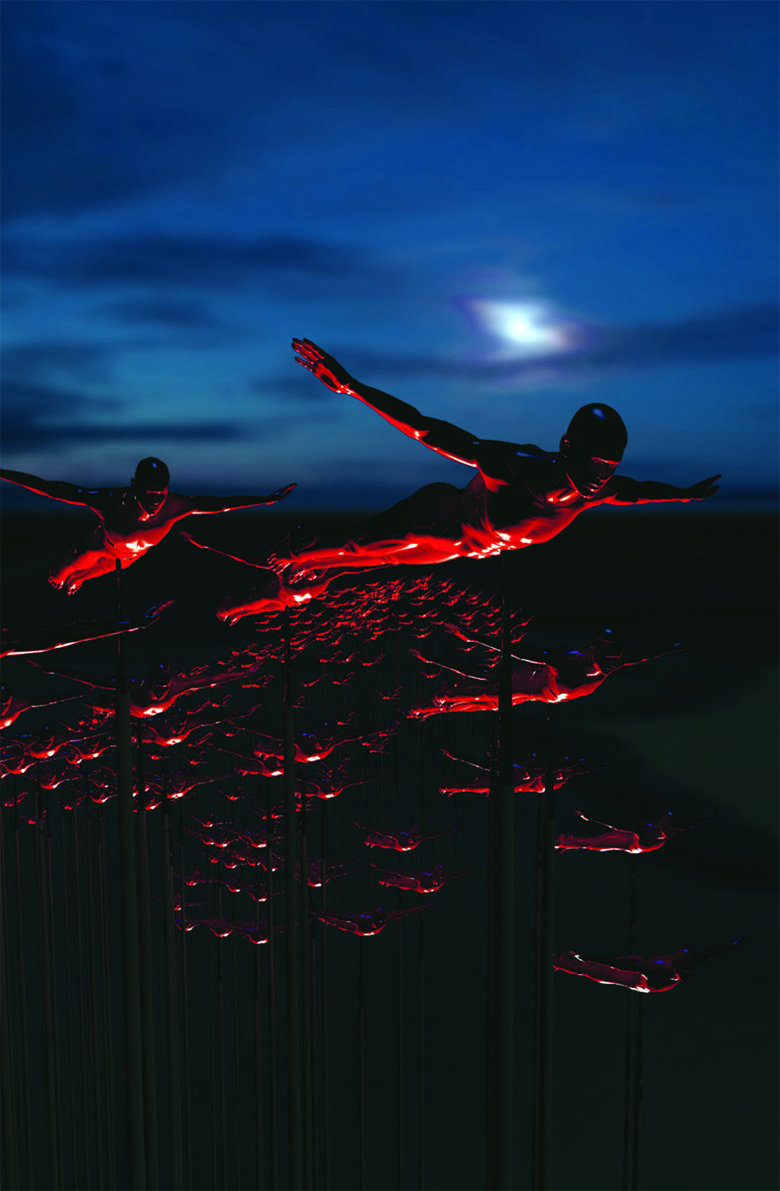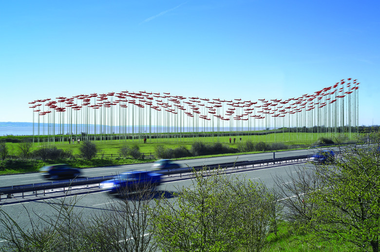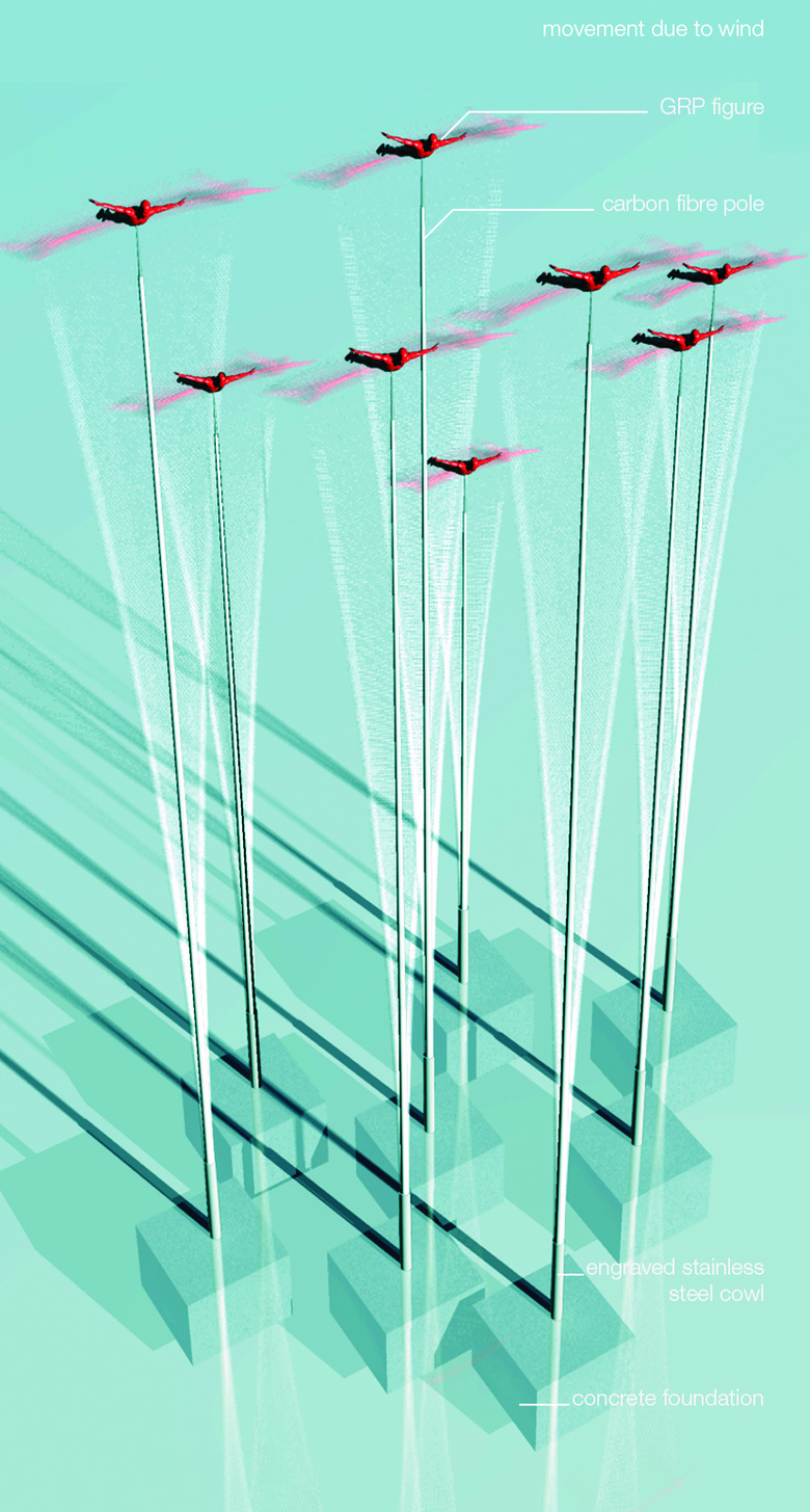 The idea is to create a soaring community of 'compatriots' in the sky - each an individual, yet all moving as one; appearing to dance with the wind like a flock of birds, with arms outstretched as if flying free in a childlike gesture of pure joy. The constant movement of the piece, which we call the 'Red Cloud', will allow it to sit sympathetically in its natural setting, swaying gently in harmony with the trees around it, even as its sheer scale takes the breath away.