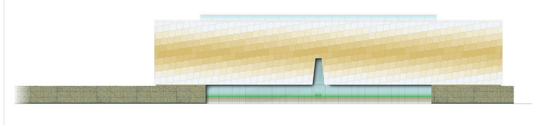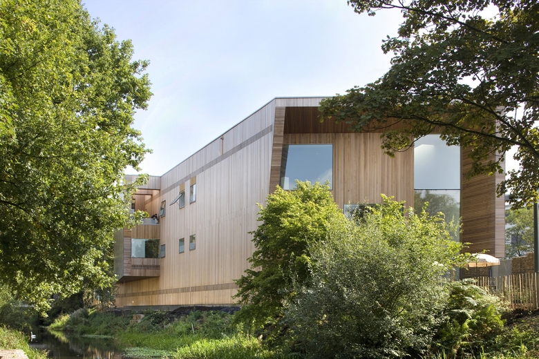 The building concept is of a jewellery box containing all kinds of precious cultural treasures. The aim was to create a gentle landmark and reflect the culture diversity of the town. Overlapping snakeskin anodised aluminium panels, in 5 shades of gold and silver, spiral up around the building. The cladding pattern, inspired by the lateral line found on fish which help them balance in water, and Byzantine gold mosaics, is designed to enrich the simple rectilinear form of the building. Cedar cladding, reflecting the softer, more pastoral and natural environment is used on the canal side elevations.