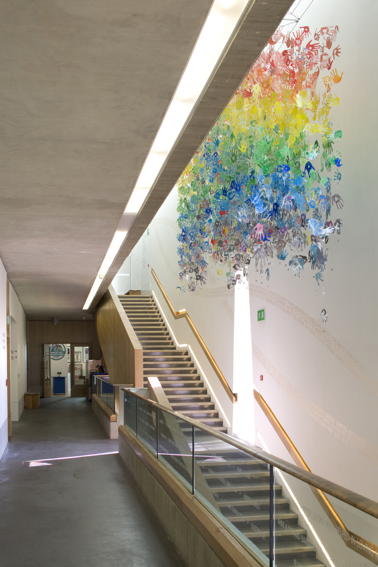 Dichroic glass strips ,create spectacular rainbow reflections from the sun in the ground floor reception and combine with the lighting artwork by Peter Freeman, to create a light touch of sparkle.