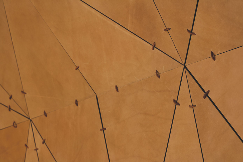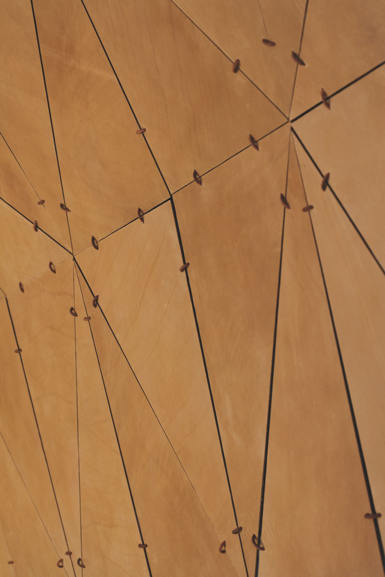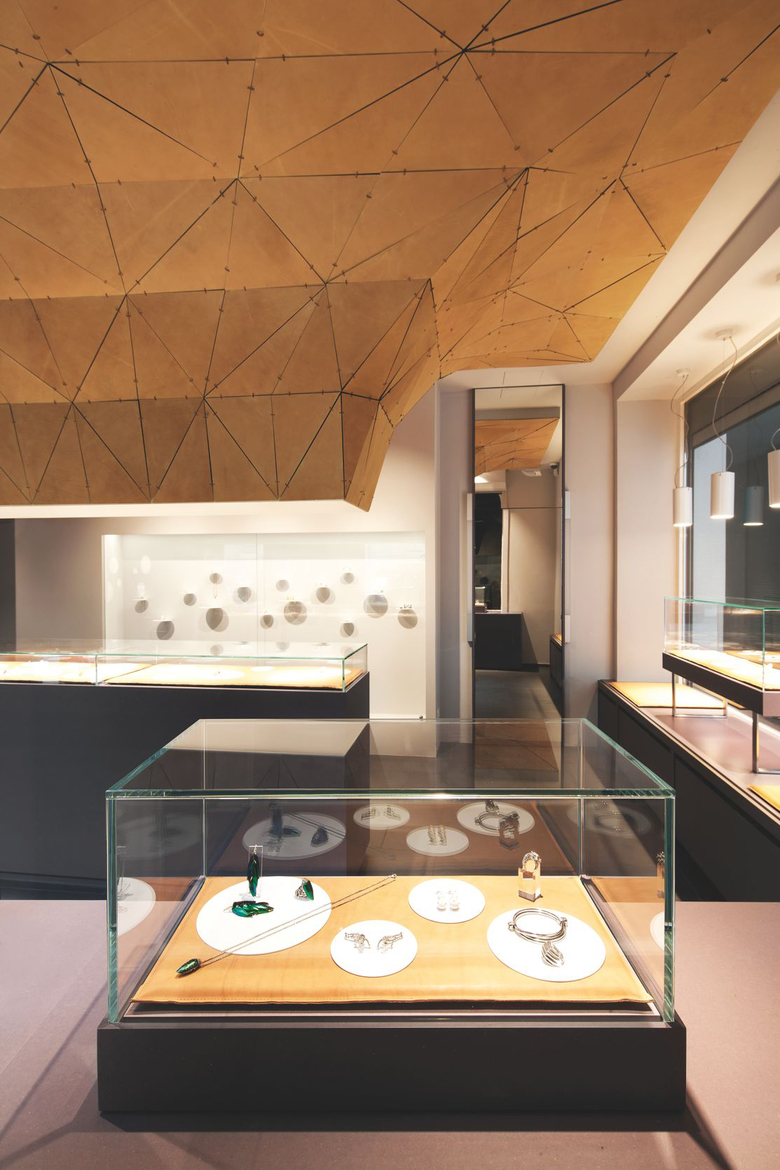 Nachdem Juwelen immer direkt auf der Haut getragen werden, wird das Material der Wahl für diesen Store auch Haut, sprich naturfarbenes Leder. Es umhüllt die zentrale Skulptur des Drops, der in der Mitte des Raumes von der Decke wächst. Seine Oberfläche fächert sich in 236 finiten Elementen auf, die einzeln mit Lederbändern untereinander verbunden sind.