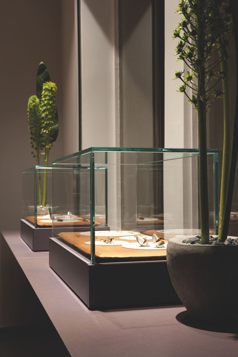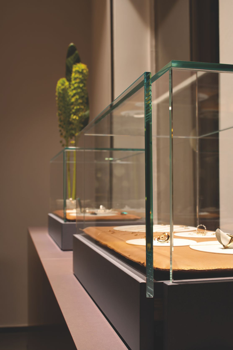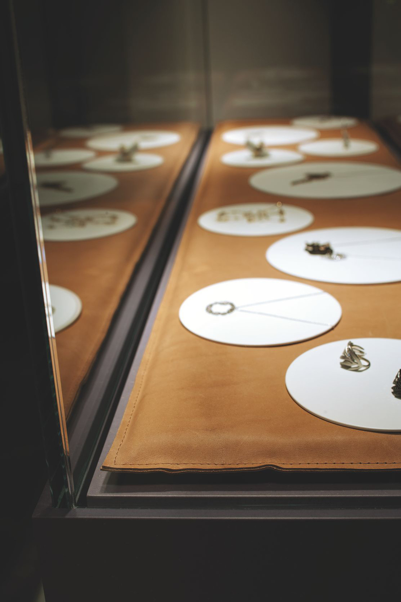 Die Umgebung nimmt sich zurück in Grautönen, während die Schmuckstücke in hell erleuchteten Wandvitrinen präsentiert werden. Die runden Ausschnitte in der Wand sowie die Plates in der Vitrine focusieren auf die Preziosen und spielen mit der Strenge des Interieurs.
