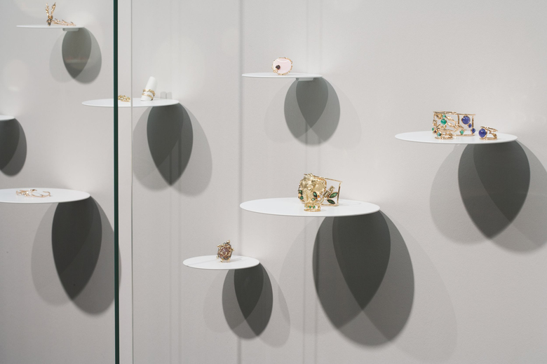 Ein kleiner Raum in allerbester Lage im Zentrum Münchens wird zum Altarraum für exquisiten Schmuck aus aller Welt. Eine Inszenierung musste her, eine Umkehr der Sehgewohnheiten, eine große Geste, die alles zentriert und den Fokus des Besuchers auf den Schmuck lenkt.