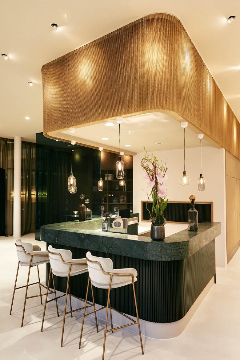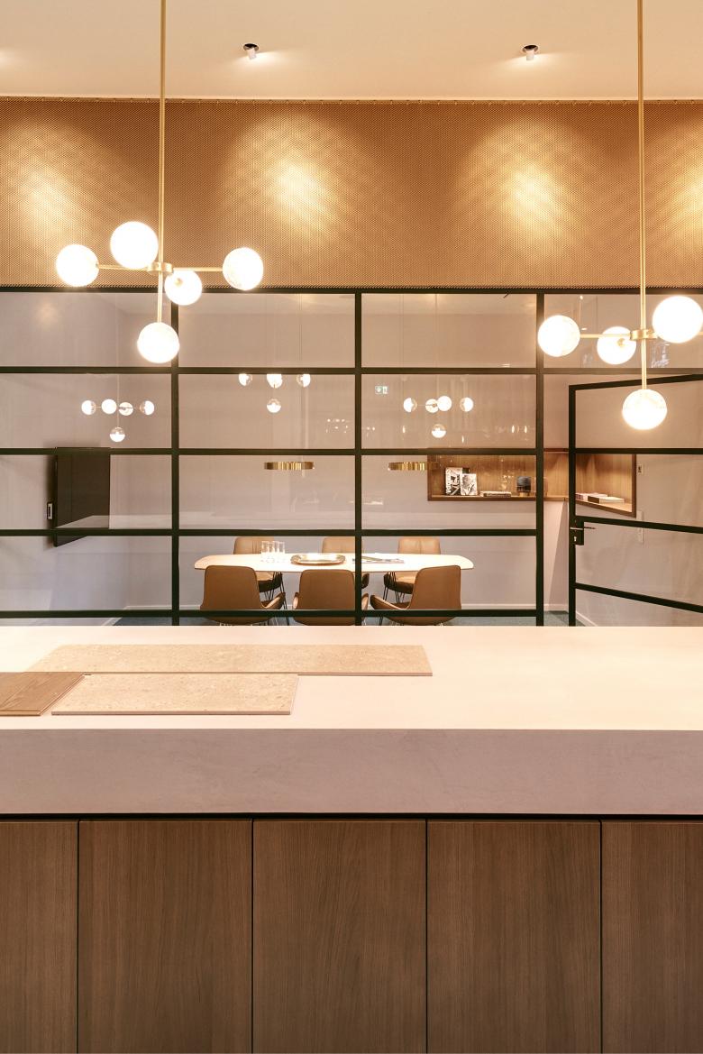 Der Showroom ist in eine Farb- und Materialwelt von weiß über messingfarben bis hin zu dschungelgrün getaucht. So werden die Besucher an der zentralen Cafébar aus dem grünen Marmor „Verde Guatemala“ empfangen. Der Metallvorhang aus Messingspiralen läuft die Decke entlang und erinnert an einem goldenen Horizont, dessen warme Lichtreflexion die Wohlfühlatmosphäre im gesamten Showroom prägt. Die einladende Weite der Fläche unterstreicht der weiße Estrichboden. Als Farbakzent blitzt immer wieder frisches Türkis auf. Als Teppich oder Sitzkissen macht es die Musik zwischen den warmen Farben und satten Oberflächen. Die Sitzgruppe mit den gemütlichen Sesseln gleich am Eingang erinnert an eine Kaminsituation. Hinter den raumhohen Glasscheiben aus getöntem Glas liegt luftigangeschlossen ein großer Konferenztisch und an anderer Stelle eine kleine Ecklounge. Hinter der gesprossten Glastrennwand wurde ein akustisch getrennter Konferenzbereich eingebaut,der Diskretion garantiert. Die lange Bench aus Echtholz präsentiert die Produktauswahl der verbauten Materialien und Oberflächen.