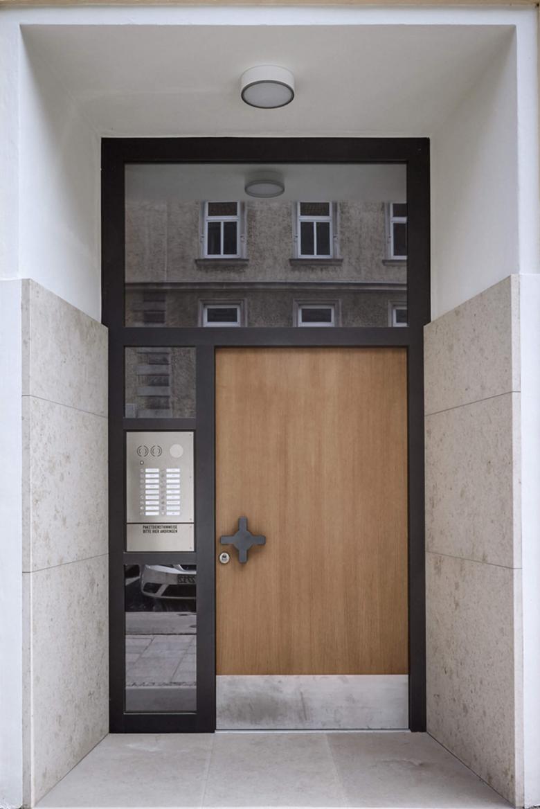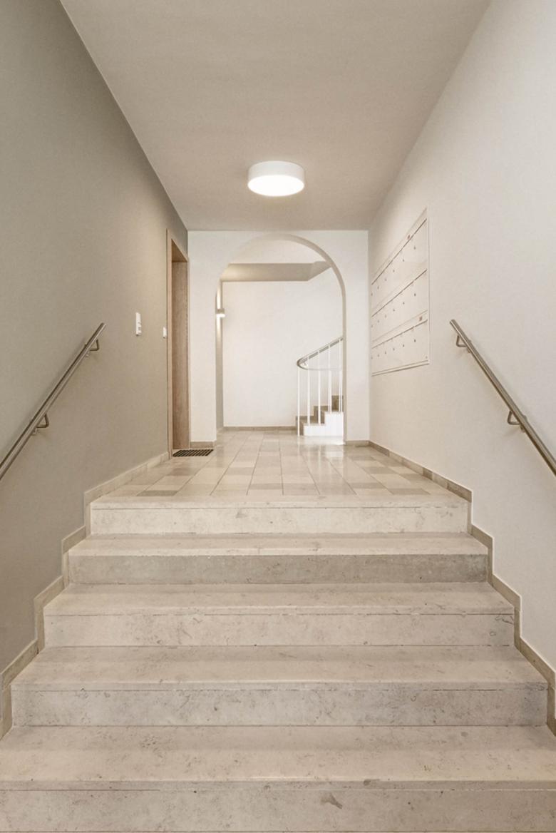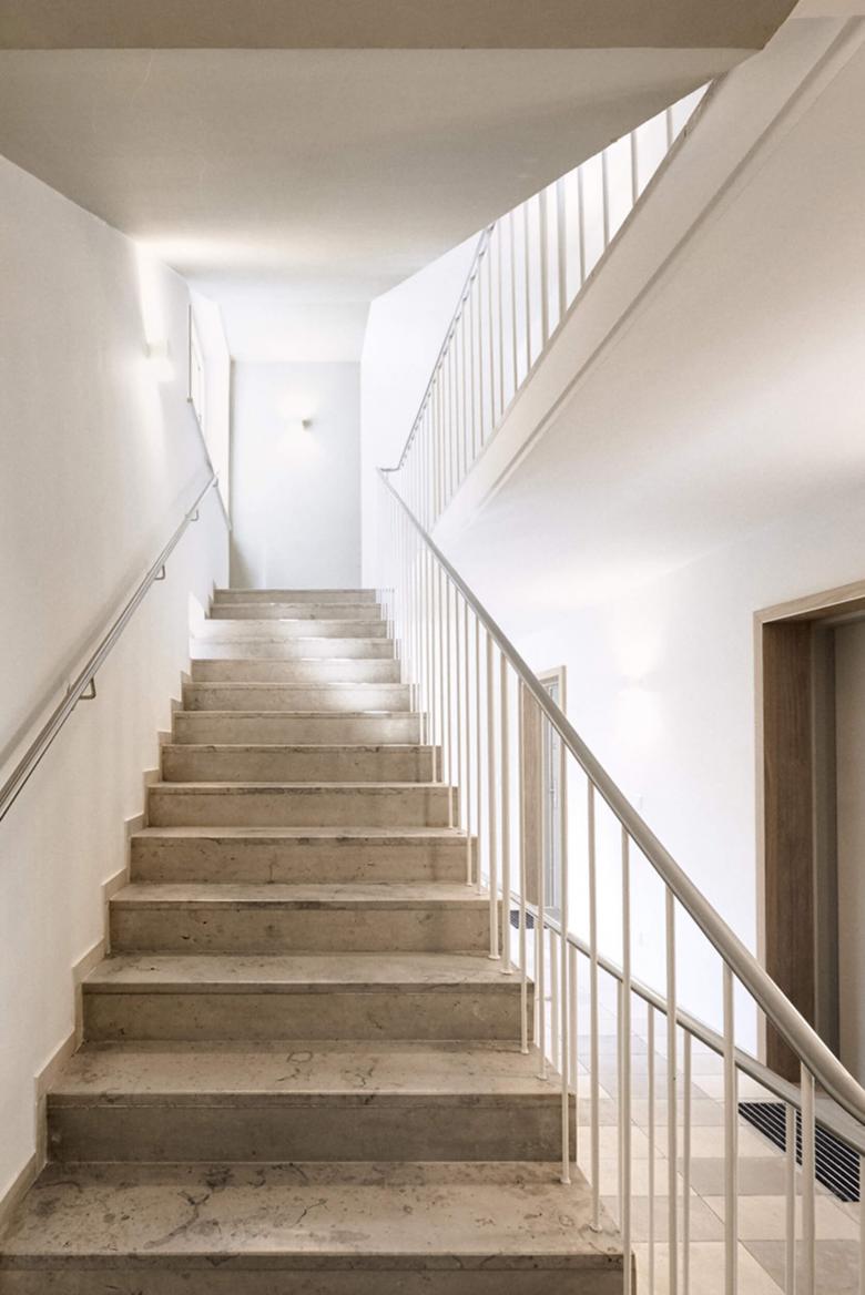 Eine Treppenhaus-Sanierung ist vermutlich einer der unsexiesten Jobs, die man als Innenarchitekt macht. Aber gleichzeitig auch einer der sinnvollsten! Denn alle Bewohner eines Hauses haben davon täglich einen unübersehbaren Mehrwert. Die Gebäude der drei Treppenhäuser sind echte Nachkriegsgemäuer mit dem typischen 50er Jahre-Standard. Dazu gehören feuchte Bodenplatten genauso, wie bewehrte Solnhofner Naturstein- und Jura-Beläge, die zum Entsorgen schlichtweg zu schade sind. Nach 60 Jahren Nutzungszeit wurden diese Böden und Treppen ausgebessert und überschliffen – das nennt sich echte Nachhaltigkeit. Im Erdgeschoss und im Keller wurde der Belag aufgrund der Feuchteschäden formatgleich mit Fliesenimitaten ergänzt. Das Farbkonzept spielt mit dem Hell-Dunkel-Kontrast, den der Lichteinfall der Fenster bringt. Ein olivgrünes Farbband läuft die Untersichten der Treppen die Geschosse hoch. Die moderne LED- Wandbeleuchtung unterstützt das Farbspiel. Die Türlaibungen der Wohnungstüren wurden mit Eichenrahmen überbaut und die Bestandstüren passend zur Akzentfarbe lackiert. Ersetzt wurden die Kunststoff-Fenster in Eiche-Alu-Fenster sowie alle Haustüren, ebenfalls in Eiche. Die kreuzförmigen Lüftungsöffnungen standen Pate für die Haustürgriffe und Verziehrungen der Geschossdecken. Völlig unaufdringlich erhalten die guten alten 50er Jahre ein Facelift, das den Charakter der Treppenhäuser neu belebt. Die Baumaßnahme ist eine ganz Leise aber Hochwertige.