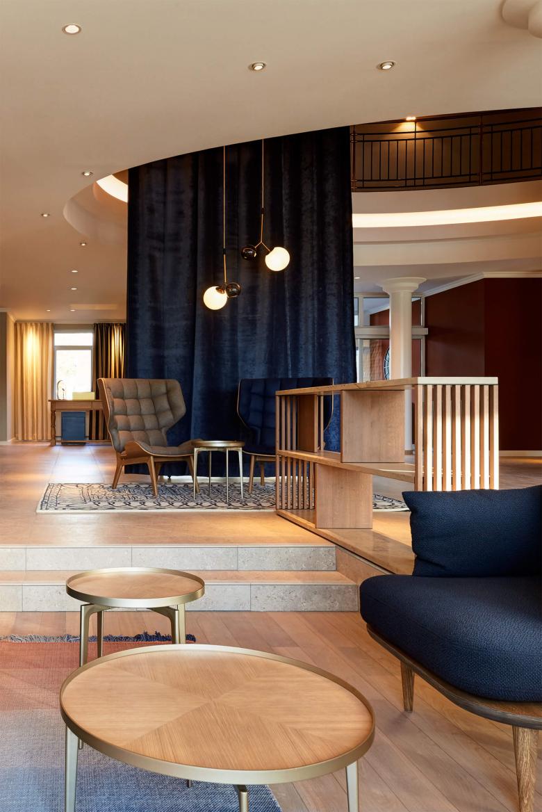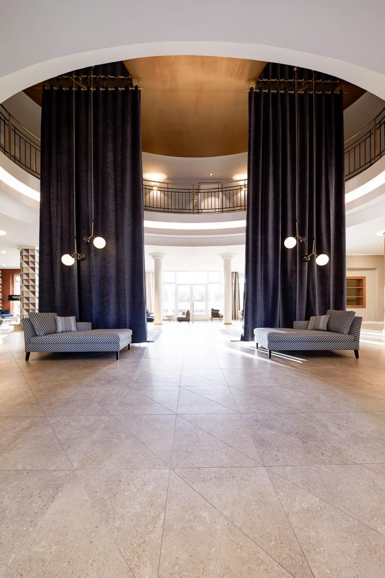 Der erste Eindruck zählt: Beim Betreten der Lobby öffnet sich ein 6m langer, dunkelblauer Samtvorhang und gibt den Ausblick frei auf das Golf-Green der Hotelanlage. Davor empfangen Chaiselonguen die Gäste, dahinter gruppieren sich Sessel und Sofas um den offenen Kamin. Living Lobby, das Wohnzimmer des Hauses, wird zum Treffpunkt für Hotelgäste, Bar- und Restaurantbesucher. Das Einchecken findet an großen rustikalen Tischen mit komfortablen blauen Samtsesseln statt.