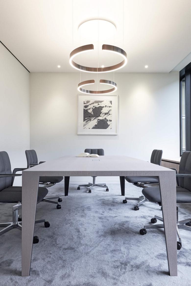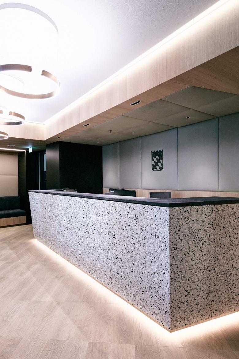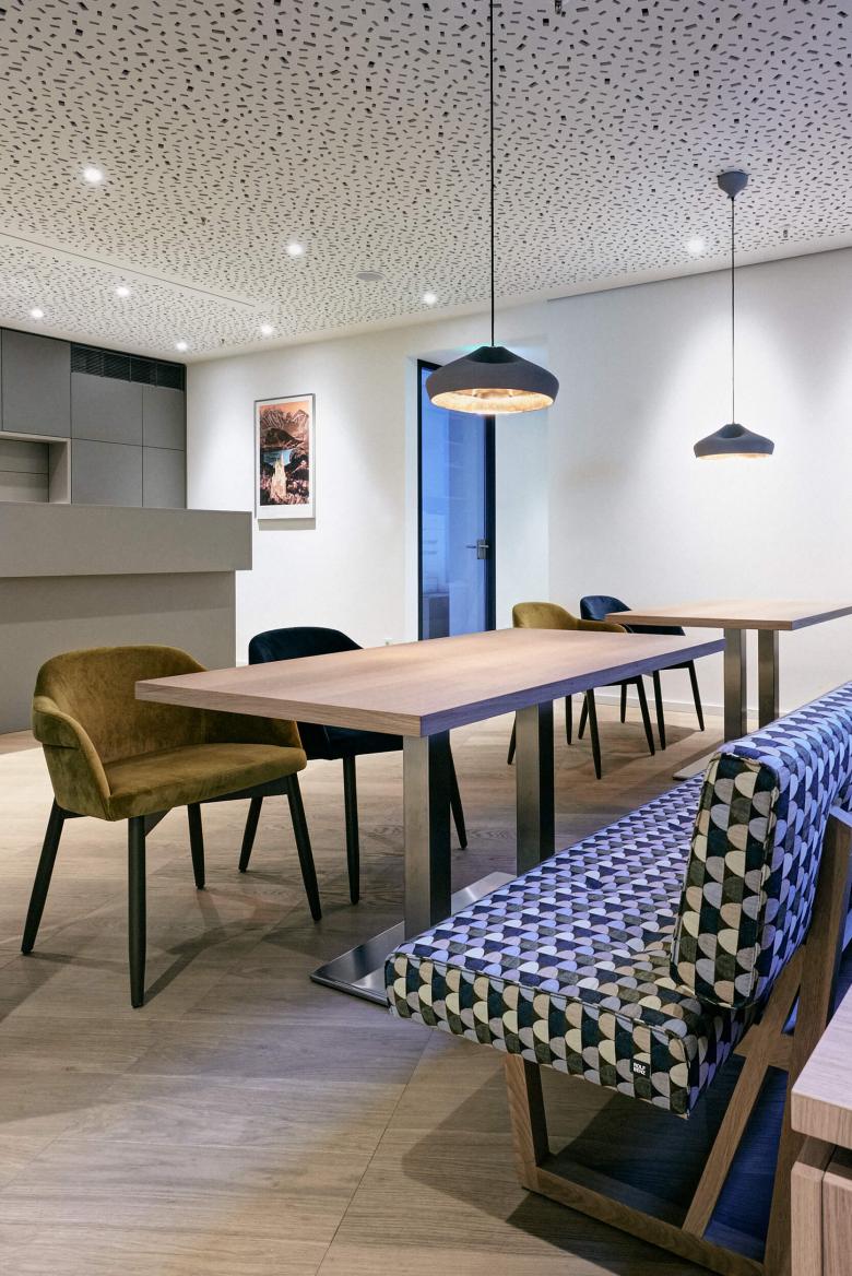 Die Feinabstimmung von Material, Oberfläche und Innenausbau waren in diesem Projekt die Aufgabenschwerpunkte. Auf die grundlegende Planung der Kollegen von „Freetech“ aufbauend, wurde der Materialkanon und die Farbwelt für die Kanzlei differenziert aufgefächert. Es galt die Balance zu finden für die hochwertigen Ausbauten und die Platzierung von Kunstobjekten. Eleganz, Leichtigkeit und Modernität wurde kombiniert mit dem seriösen Erscheinungsbild eines Notars. Heller Terrazzo, luftig-textile Raumteiler und das wertige Besprechungsmobiliar in Leder und Eiche empfangen die Kanzleibesucher. Dezente Farb- und Musterakzente bespielen den Office-Trakt, der sich über ein offenes Bistro mit Café-Theke angliedert.