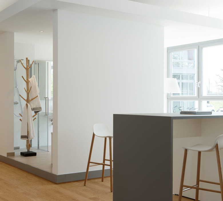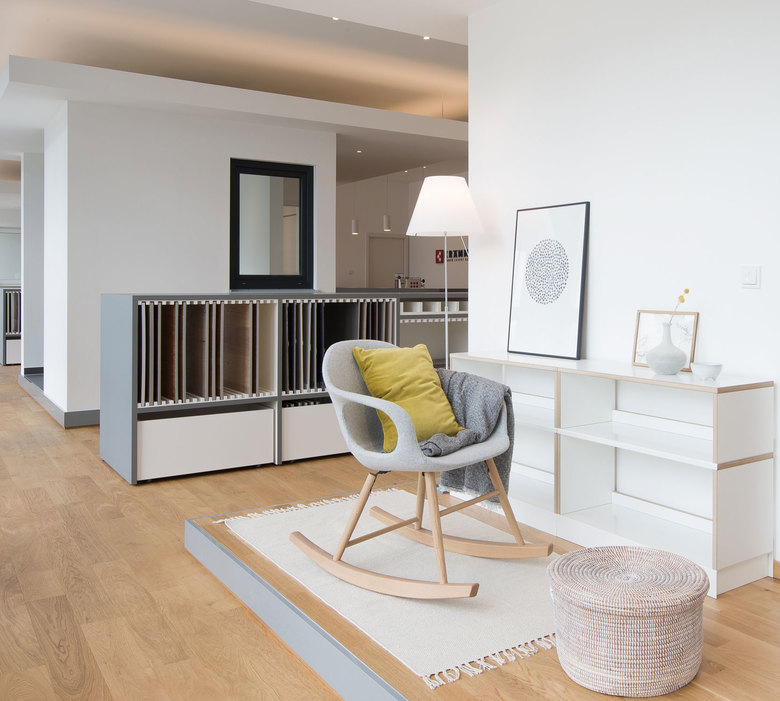 Der Showroom präsentiert drei abgestimmte Wohninseln, die als Besprechungsgrundlage für weitere Bemusterungen dienen. Die Kombination von Böden mit Tür- und Fensterelementen, sowie eingebaute Bäder vermittelt die Raumqualität der Immobilie als Ganzes. Die Kunden erleben einen echten 3 dimensional gebauten Ausschnitt ihrer neuen Wohnung und können mit dieser Grundlage besser entscheiden.