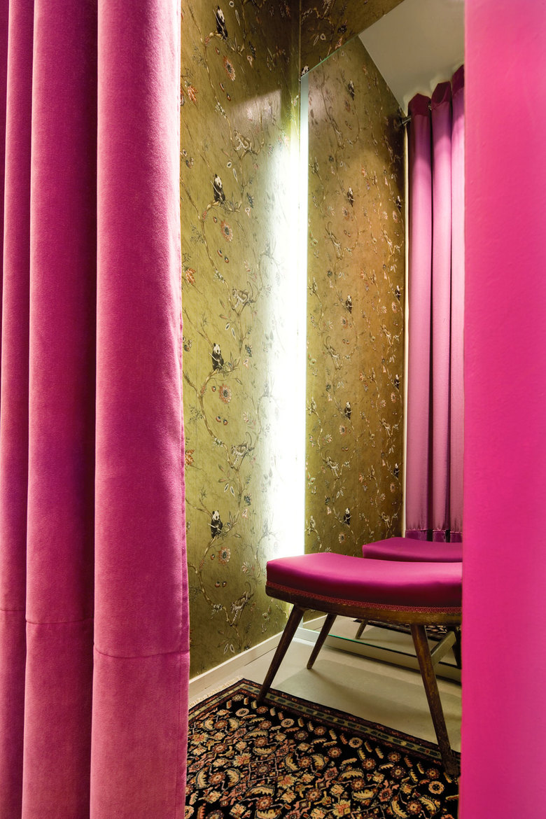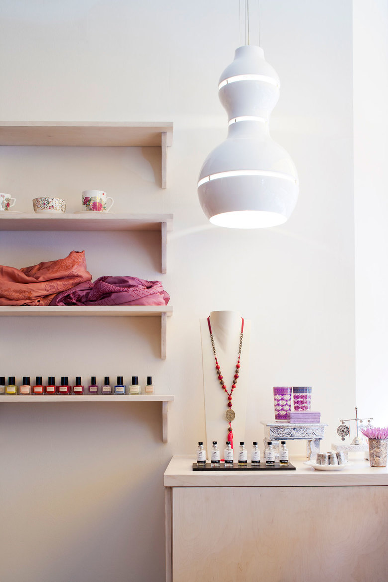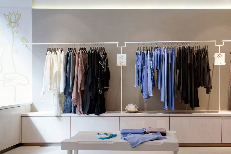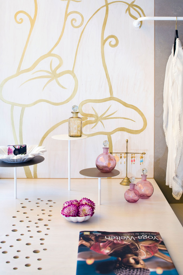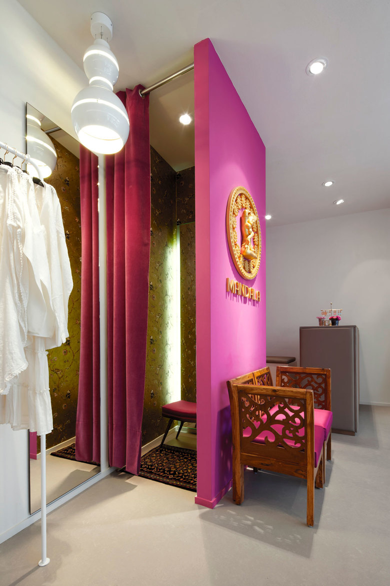 Nachdem das Label seit über 10 Jahren erfolgreich am Markt präsent ist, wurde nun der erste Mandala Shop in München eröffnet. Ein Schmuckkästchen für Yoga-Freunde und Yoga-Freuden sollte es werden. Ausgehend von der hochwertigen Kollektion in Handschmeichlerqualität und des „en détail“ liebevollen Markenauftritts wurde ein dezent verspielter Entwurf umgesetzt. Zu der kräftigen Hausfarbe in pink schmiegt sich ein elegantes Grau und ein feines Weiß. Den Bogen nach Indien spannen goldene Elemente, wie das Logo des Hauses, Tigertapeten oder Malereien auf den Möbeln. Die guten Gaben für die guten Kundengeister werden auf kleinen Tableaus serviert. Nur üben müssen die Yogis selbst, für den Rest ist gesorgt.