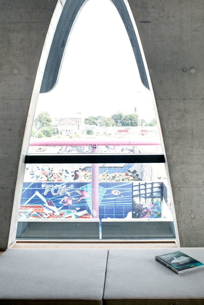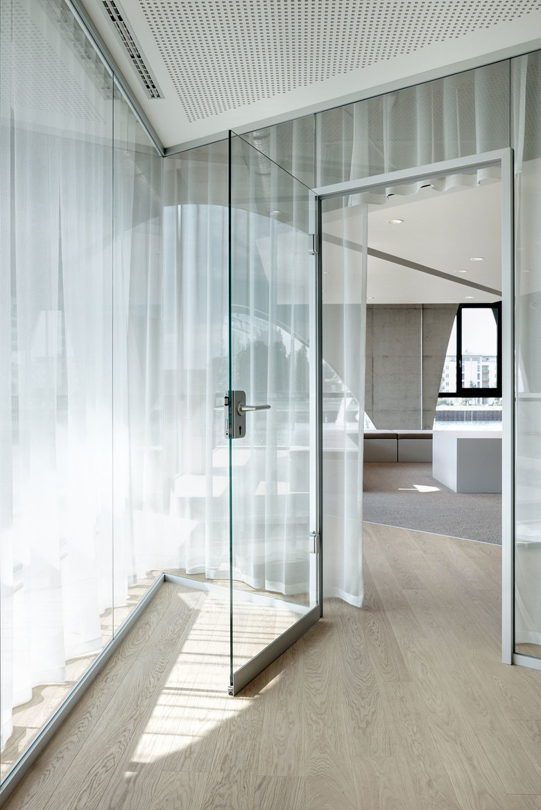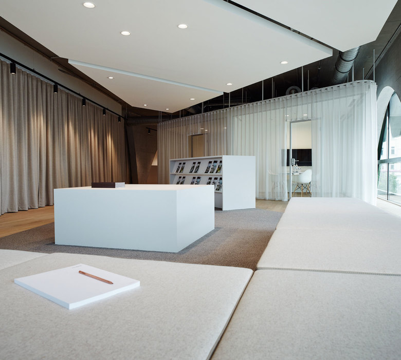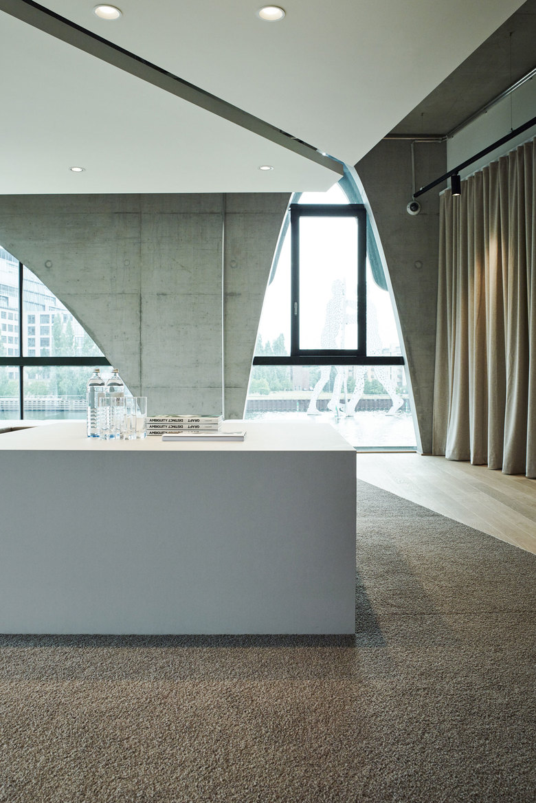Losgelöst von der Fassade gliedern sich polygonale Räume aneinander, getrennt durch Glastrennwände mit textilen Vorhangelementen. Der schroffe Sichtbeton erhält ein wohnliches Gegenüber mit Holzdielenboden, Teppichzonen und eine individuell angepasste Beleuchtung. Das zukünftige Wohnen an der Spree lässt sich im Showroom bereits bestens erahnen...und erwerben.