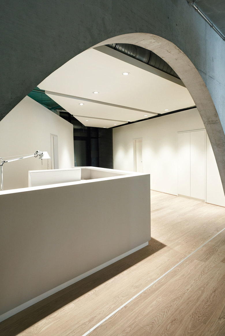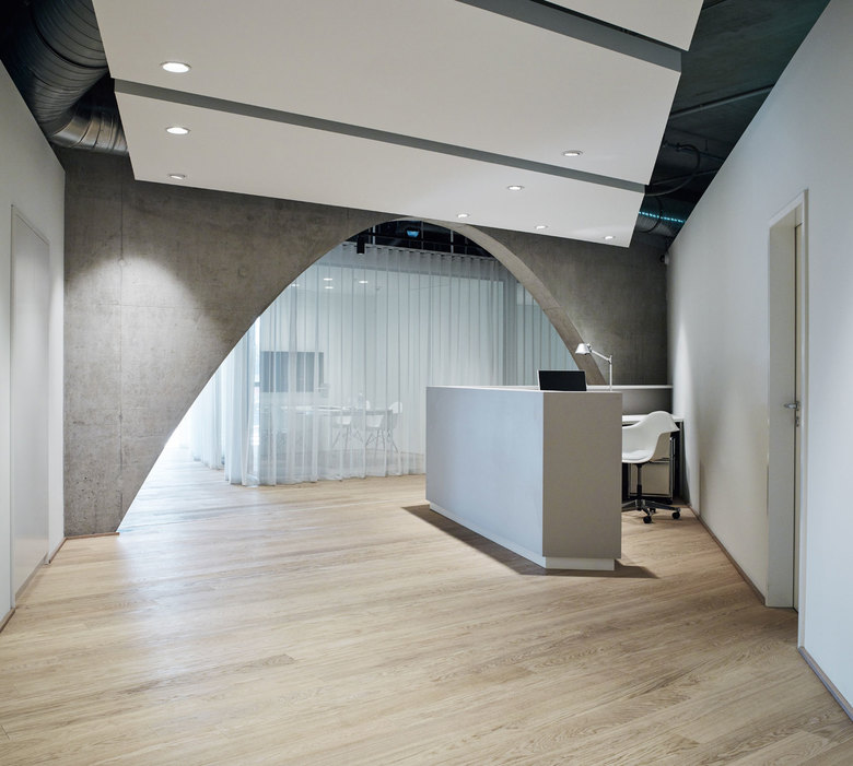 Direkt an der Spree liegt das Projekt und der neue Showroom. Die raumprägende Fassade mit den Bogenfenstern gab für die Innenraumgestaltung den Ton an. Es galt eine eigenständige Welt zu entwickeln, die weder in Konkurrenz tritt noch untergeht neben dem Bestand.