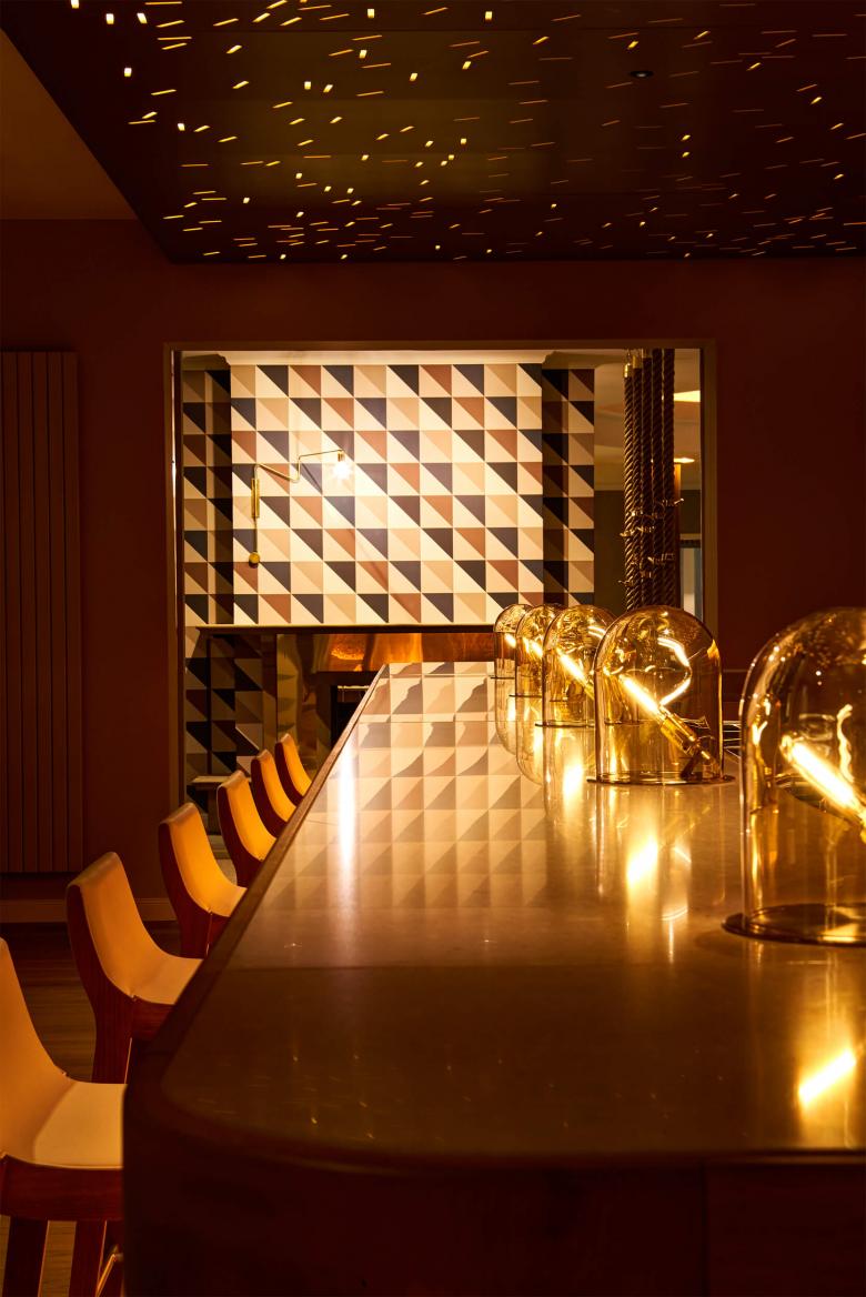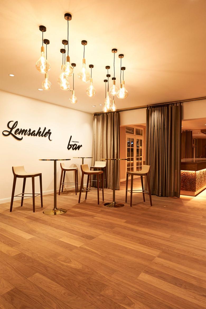 Was früher der Schmied ist heute der Barkeeper: ein echter Kerl! Ja, wir sind in einem Landhaus. Aber nein, Pferde gibt es nicht mehr am Gutshof Treudelberg, aber dennoch Feuer! Der neue Schmied trägt ein weißes Hemd mit Fliege unter der Lederschürze und zaubert das Feuer in die Drinks seiner goldglühenden Bar. Das Motiv des Funkenfluges zeichnet das Lichtspiel über der Bardecke. Die golden schimmernde Rückwand der Bar spiegelt den Ausblick in den Park nach innen und taucht ihn in ein warmes Licht. Für die Thekenverkleidung wurde eine individuell gelaserte Oberfläche mit 3D- Effekt entwickelt und handwerklich mit Goldtönen patiniert. Für große Freundeskreise kann sich die Bar in Richtung Restaurant erweitern. Für intime Abende schafft ein trennender Vorhang eine heimelige Nische mit Blick auf den Kamin in der Lobby.
