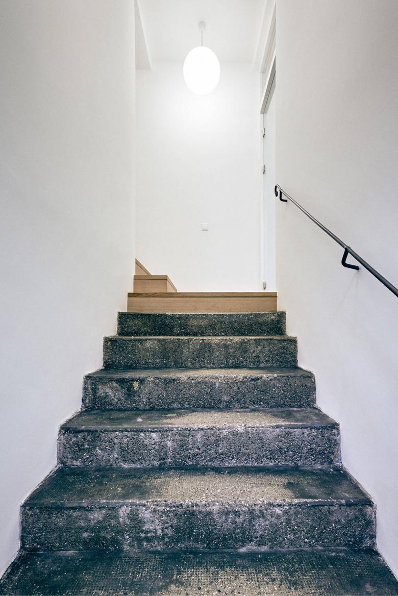 Das Ergebnis der Umnutzung sind völlig neue Raumstrukturen, helle, lichtdurchflutete Büroräume, ausgestattet mit Fischgrätparkett aus Eiche, Haustechnik auf neuem Stand und moderne Glastrennwände, die die Vorstandsräume akustisch diskret trennen, aber doch Transparenz zulassen. Respektiert wurden die abgeschrägten Ecken der Unterzüge, damit die alte Struktur ablesbar bleibt. Und überlebt hat die alte Kellertreppe, die noch die Geschichte erzählt, wie damals die Bierfahrer die Bierfässer in den Keller schleppten.