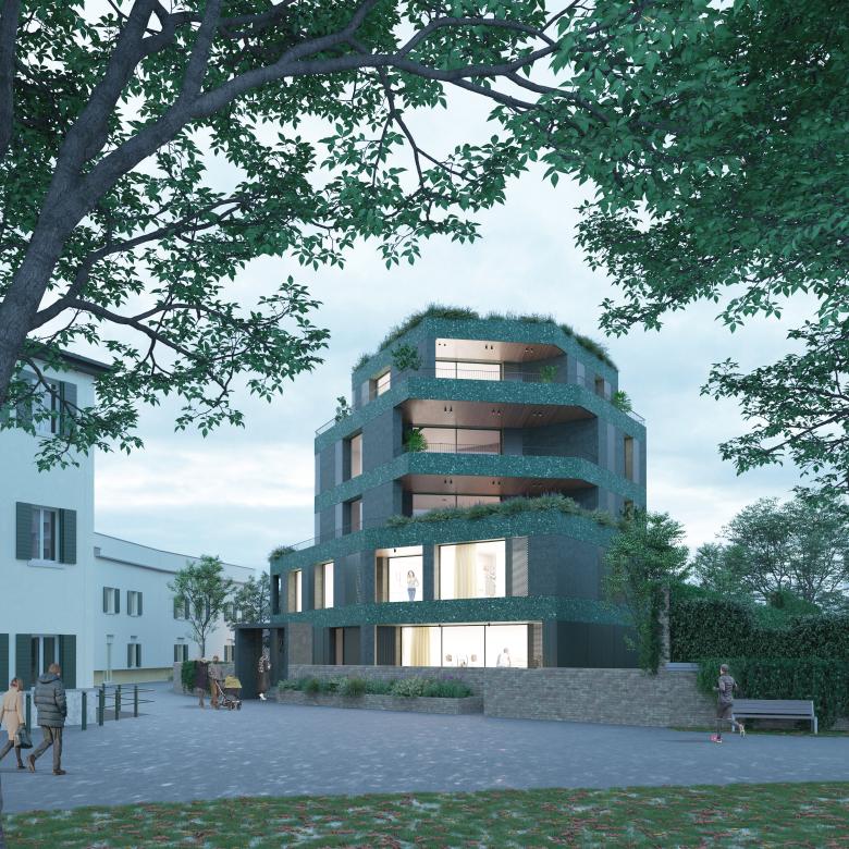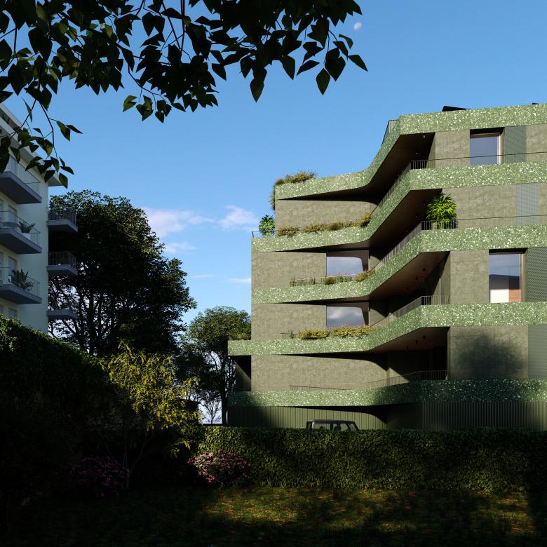 Il nostro studio ha concepito un edificio di cinque piani, composto da nove appartamenti di diverse metrature. Al piano terra sono stati progettati una zona wellness con spa e palestra, parcheggi interni per biciclette e posti auto coperti. La copertura dell'edificio ospita, oltre ai pannelli fotovoltaici, una terrazza comune a disposizione dei condomini.