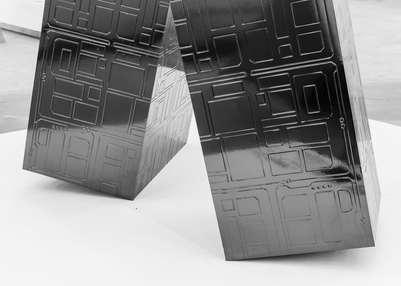 The sculpture 's form bares multiple insignia. The texture engraved on its surface is an abstracted map of cycling routes. The two giant, unstable blocks represent the large number of cyclists on the road and the fragility of their rights. While the tungsten steel surface has the appearance of a robot from a sci-fi film. Hence, we named the sculpture, CR -1.