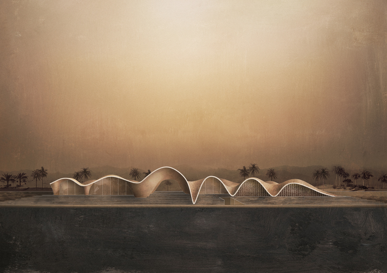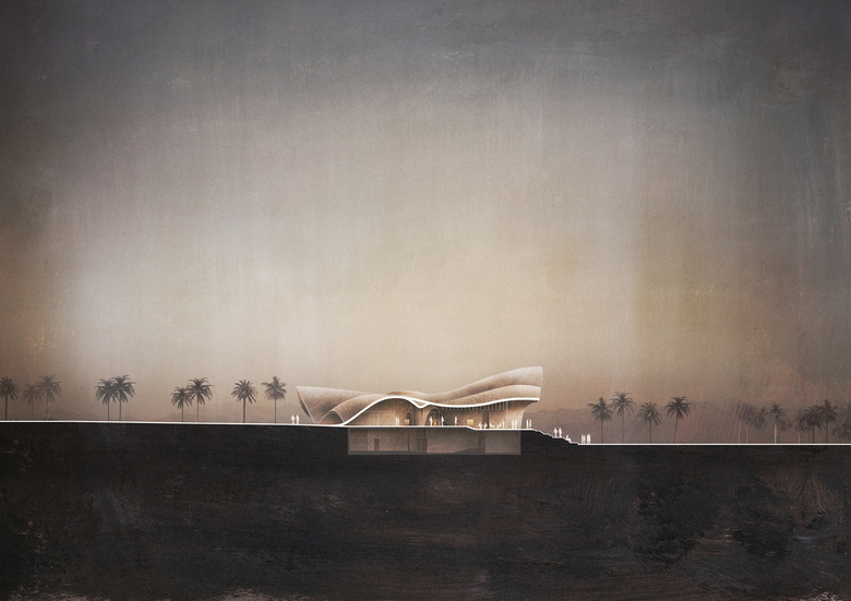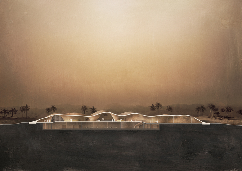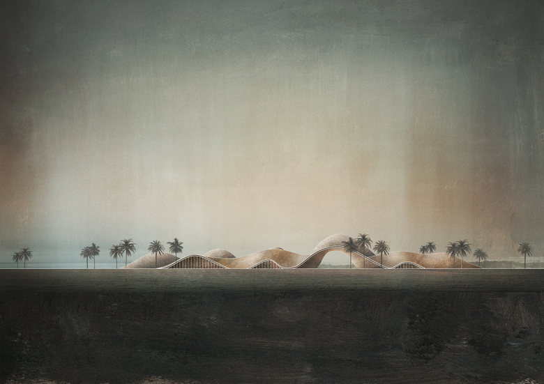 Der Standort liegt an der Schnittstelle zwischen Israel, Ägypten und Saudi-Arabien und nur etwa 130 Kilometer südlich der antiken Stadt Petra. Er ist von ikonischen Landschaften umgeben. Angesichts dieser natürlichen Schönheit und des ausgeprägten Ortscharakters haben wir uns von den sanften Dünen der Küste inspirieren lassen, um herauszufinden, wie wir die Wüste „anheben“ und „aushöhlen“ könnten, um stille, poetische Bauformen zu schaffen.