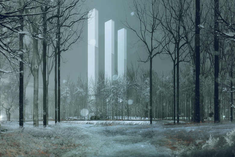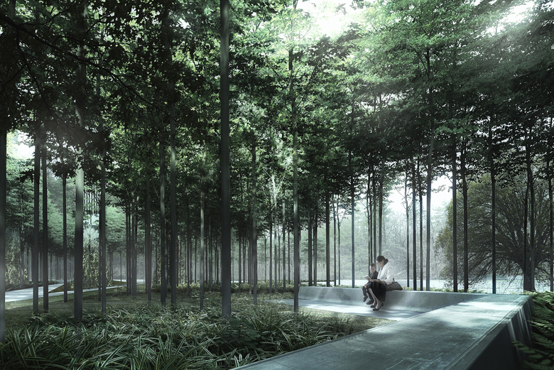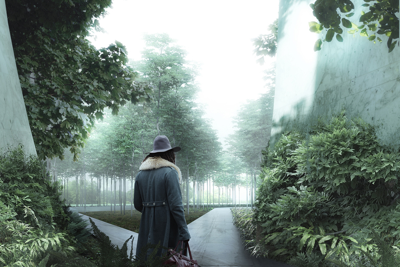 Obwohl das Gelände an einen bestehenden Garten im Renaissancestil grenzt, beginnt unsere architektonische Erzählung im Wald des Hörnli-Friedhofs. Der neue Weg führt durch das Waldinnere und eine Abfolge kontemplativer Räume, wobei sich das Triptychon der skulpturalen Schornsteine allmählich offenbart und so auf die Präsenz des Krematoriums hinweist. Der Wald schafft einen stillen, nachdenklichen Rahmen für Momente der Ruhe und des Innehaltens. Erinnerungen und Gefühle dürfen beim Gehen wirken, während Trauernde verschiedene Pfade und Räume erkunden.