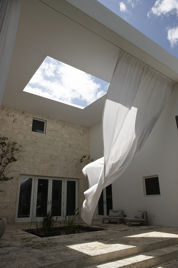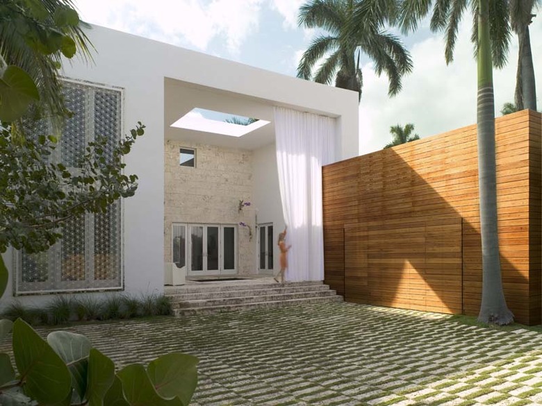 Das Projekt, ein unauffälliges, einstöckiges Wohnhaus, dem tropischen Klima von Miami optimal angepasst. Die innovativen Maßnahmen überzeugen in ihrer Gänze, wobei an der bestehenden Struktur nur minimale Änderungen vorgenommen werden mussten. Das Haus wird durch einen 6x9x9m-großen Bereich betreten, in dem ein Reflexionsbecken und ein Ochsenauge so ausgerichtet sind, dass sie eine optimale Leuchtdichte in den Bereich filtern. Ein großer Raum unterteilt das Haus in private und öffentliche Bereiche. Gigantische Räume mit überdimensionierten Fenstern überblicken den Pool und den Kanal. Ein 18x6x6m-Außenwohnbereich ist im hinteren Teil des Hauses konzipiert. Eine große runde Säule enthält eine Außendusche mit einem offenen Deckenbereich. Die zweite Etage umfasst einen abgeschlossenen Gartenhof außerhalb des Hauptschlafzimmers für private Aktivitäten. Das Projekt bietet eine flexible Infrastruktur die ausgelegt ist, um eine optimale Lebensqualität zu gewährleisten.