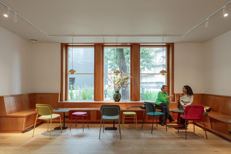 Sustainable materials were a shared priority between the client and the design team. Recycled PET bottles were used in making the colorful chairs, and original Bakelite door hardware and lamps were restored. New ton-sur-ton tiles complement the restored original tiling, while climate-positive marmoleum flooring and recyclable PVC roofing add further eco-friendly features to the building.
