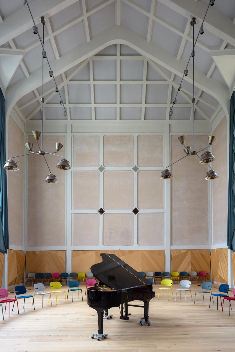 To enhance comfort, underfloor heating was installed in the music studios, eliminating the need for radiators in front of the windows and providing a connection to the outdoors. Ceiling radiant panels in larger spaces kept the concrete trusses visible, while a restrained color palette in the new music hall, rehearsal studios, and piano studio ensures a modern but respectful homage to the building’s historical essence.