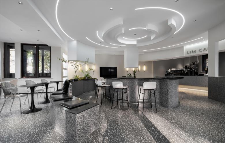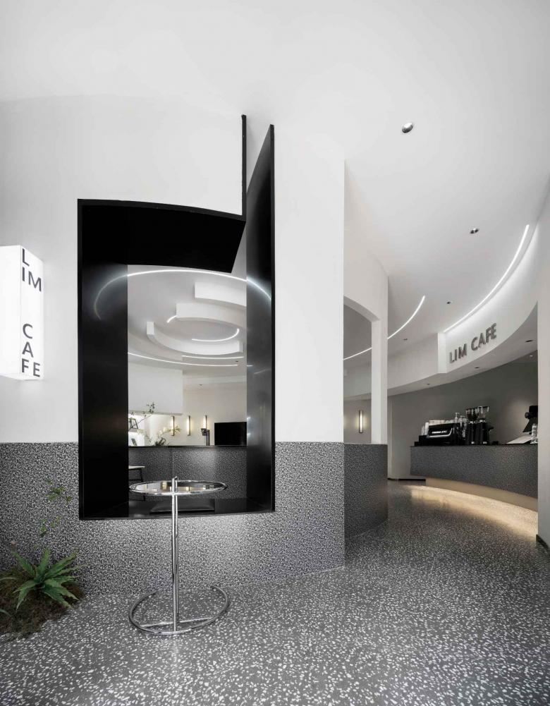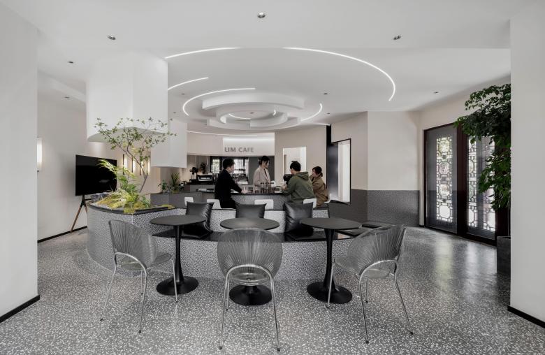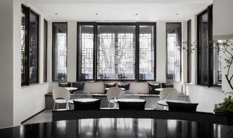 在项目中我们使用深灰色水磨石、黑色石材来营造空间的基调,为了与既有仿古建筑的新苏式肌理形成对比,最后用到一些绿植来调和整体黑白灰的色调。