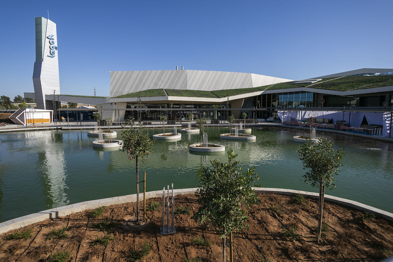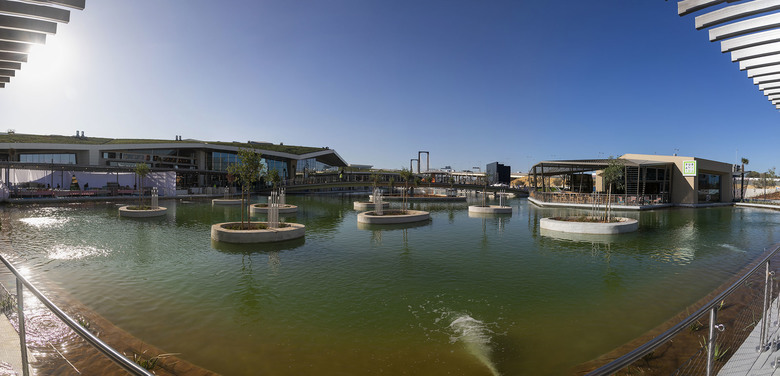 The plan is to create a large green garden of native plants around an artificial lake, hosting the leisure facilities among small hills punctuated by a series of milestones along the route: the amphitheater, a children's playground, the auditorium, the beach, until it reaches the pier opposite the leisure and sports facility. In formal terms, the building is comprised of two levels and includes large open spaces, glazed facades, and skylights, with a special emphasis on the connection between interior and exterior spaces. The restaurant, food court and gourmet market areas are located in front of the lake. This section, where the building is of lower height, is covered in a green roof that improves the comfort of the zone and favors its integration with the environment.